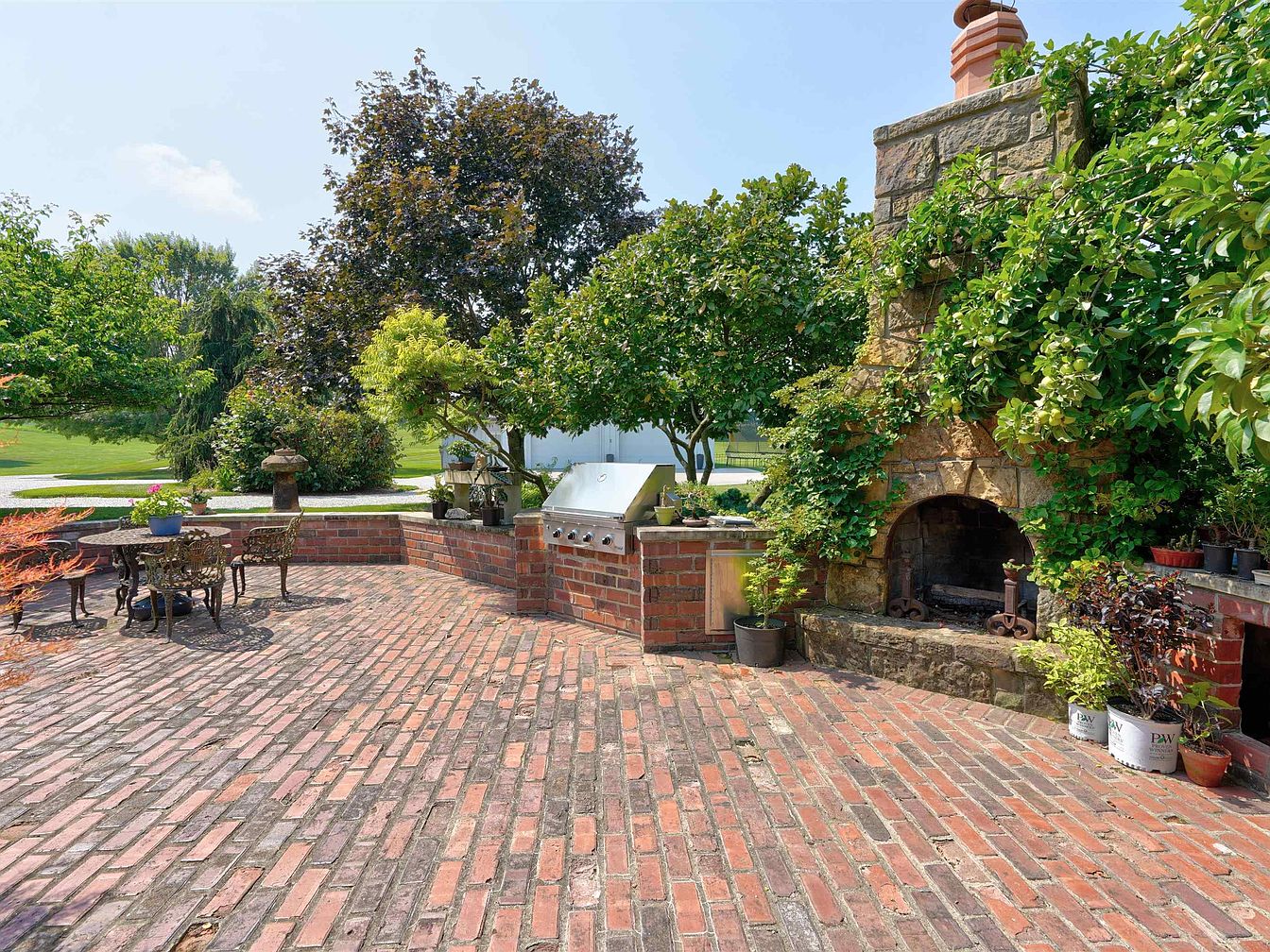 This charming outdoor living space features a beautifully laid brick patio, flanked by lush greenery and colorful plants, creating an inviting atmosphere for relaxation and gatherings. The centerpiece is a rustic stone fireplace, entwined with climbing plants, providing both warmth and character. Nearby, a modern grill awaits culinary adventures, perfect for family barbecues. The wrought iron furniture adds a touch of elegance while ensuring comfort for socializing. The open layout seamlessly integrates with the surrounding landscape, offering picturesque views of maintained gardens and trees. This space is beautifully designed for entertaining and enjoying outdoor leisure time.