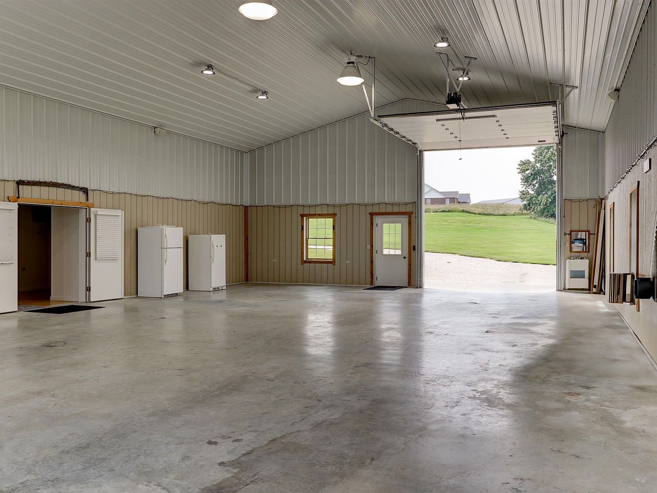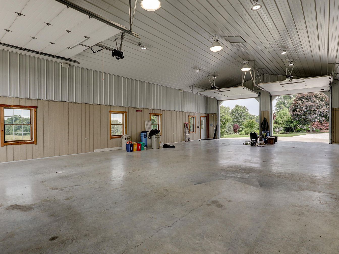 This generous garage showcases a functional design, emphasizing practicality with ample space for vehicles and storage. The high, vaulted ceiling enhances the open feel, while the bright LED lighting ensures visibility and warmth. A seamless concrete floor offers durability and easy maintenance, ideal for a busy household. White appliances, including refrigerators, provide convenient access to refreshments, making it perfect for family gatherings or projects. Large windows not only invite natural light but also provide pleasant views of the surrounding landscape, blending indoor and outdoor spaces effortlessly. This garage balances utility with a welcoming atmosphere.