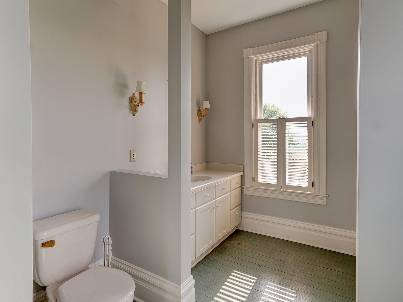 This charming bathroom features a serene layout with soft gray walls that inspire tranquility. The meticulously polished wooden floors offer a subtle contrast to the white cabinetry and fixtures. A classic double-sink vanity provides ample storage, complemented by golden sconces that add a touch of vintage elegance. Natural light floods in through the large window, which is adorned with decorative shutters, creating a bright and airy atmosphere. The space combines practicality with style, offering a family-friendly ambiance where functionality meets aesthetic appeal, making it perfect for everyday use and relaxation.