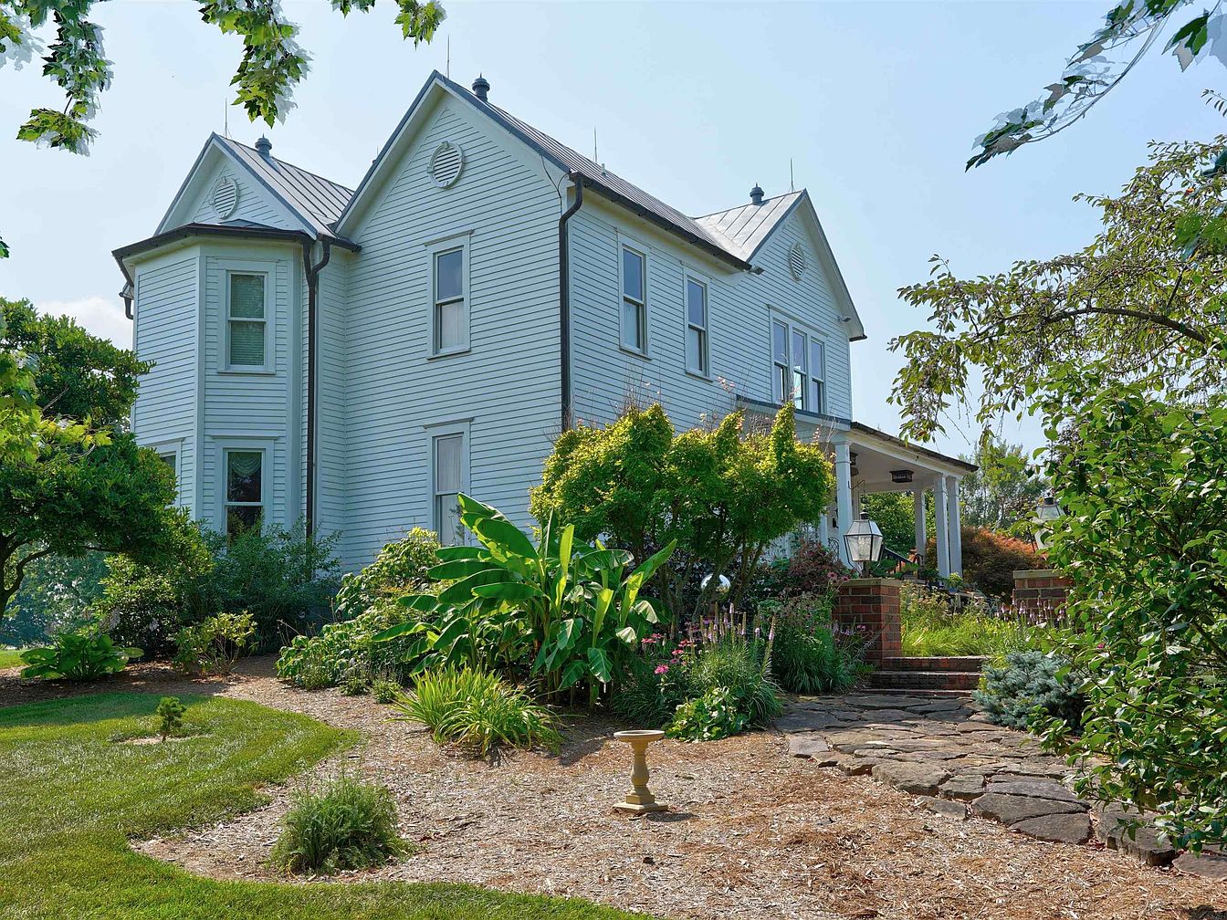 This picturesque American home highlights a charming blend of traditional and contemporary architectural styles. The two-story design features crisp white siding and intricate detailing, accentuated by a stylish metal roof. Lush gardens surround the house, filled with vibrant plants, which create a welcoming atmosphere and rich textures. A cobblestone path leads to an inviting entryway, offering a seamless transition from nature to home. The manicured lawns and carefully arranged flower beds provide a delightful play space for families, enhancing the overall appeal of this cozy, family-friendly abode. Enjoy the beauty of outdoor living with delightful garden views.