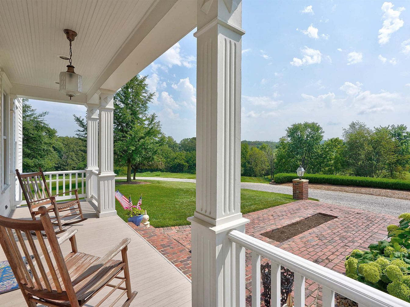 A welcoming front porch features iconic rocking chairs, inviting moments of relaxation and conversation. Crisp white columns frame the space, adding architectural elegance. The porch floor, laid with light-toned flooring, contrasts beautifully with the brick pathway leading to a lush, green yard. This outdoor area is perfect for family gatherings, surrounded by nature’s tranquility, showcased by splendid views of rolling hills and mature trees. Potted hydrangeas and vibrant American flags add a splash of color and patriotic charm. A stylish lantern pendant hanging above enhances the inviting ambiance, perfect for enjoying warm summer evenings.