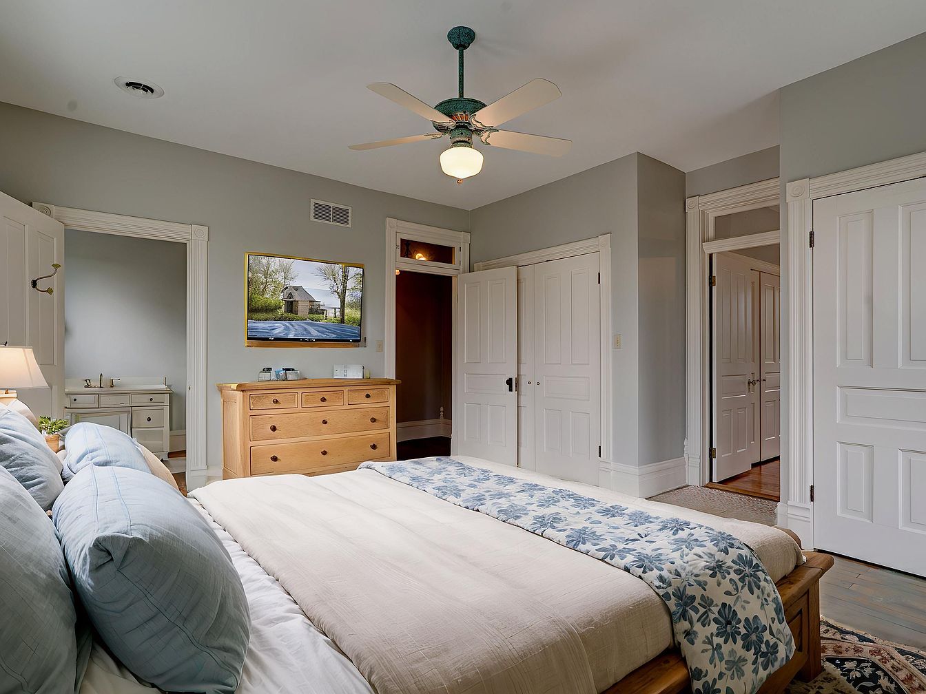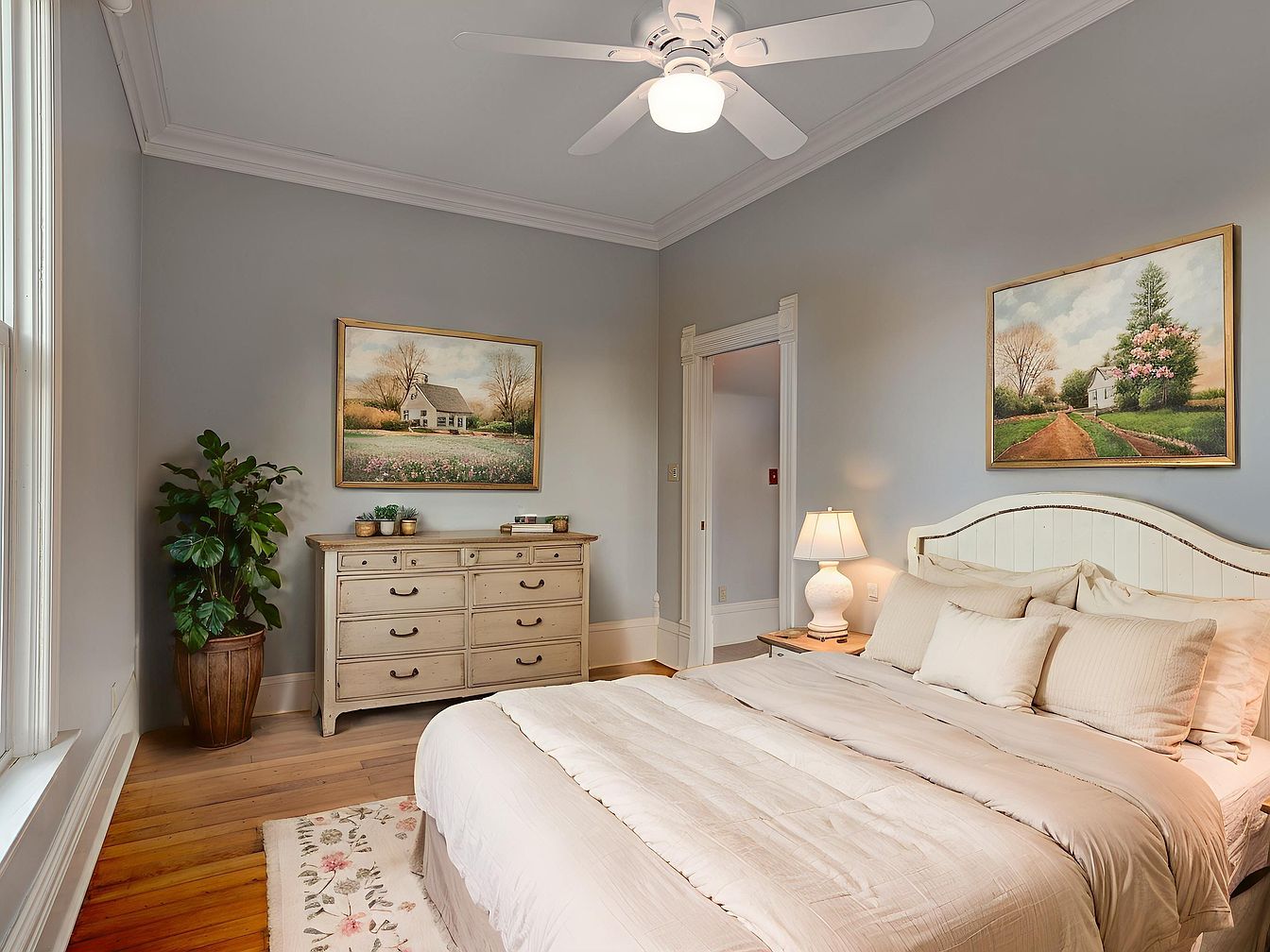 This serene master bedroom exemplifies a perfect blend of comfort and elegance. Soft gray walls create a calm atmosphere, while intricate molding adds a classic architectural touch. The centerpiece, a spacious wooden bed adorned with plush blue and neutral linens, invites relaxation. Natural light floods the room, accentuating the beautifully patterned bedding and the warmth of the wooden furniture, including a charming dresser. A tasteful ceiling fan offers functionality and charm, while the wall-mounted TV provides entertainment. Family-friendly features like ample storage and cozy seating create a welcoming space to unwind or share special moments.