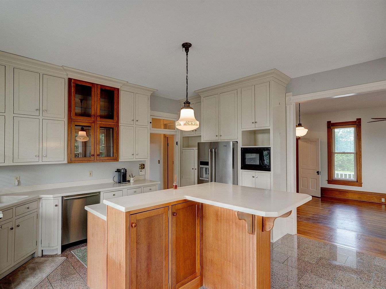 This inviting kitchen features a blend of modern functionality and classic design, perfect for family gatherings and culinary adventures. The spacious layout incorporates sleek white cabinetry, complemented by warm wooden accents, creating a harmonious atmosphere. A central island serves as both a prep space and breakfast bar, fostering togetherness. Large windows bathe the room in natural light, highlighting the polished granite countertops and stainless steel appliances. Striking pendant lights add a nostalgic touch, enhancing the vintage charm. Thoughtful details include ample storage and easy access to the adjoining dining area, ensuring convenience in this heart of the home.
