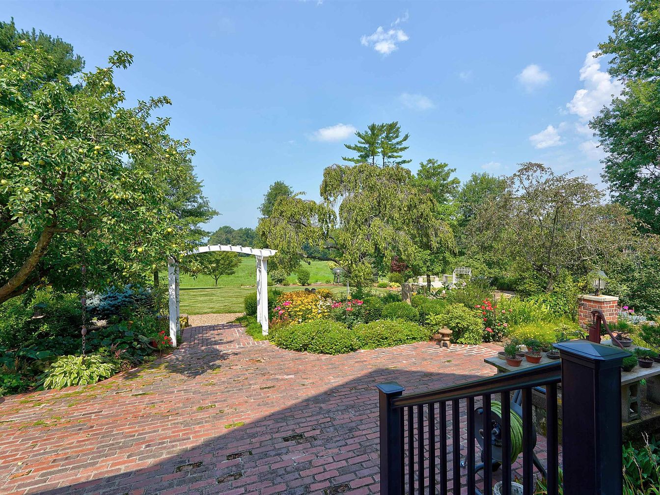 A charming garden pathway leads through a vibrant landscape bursting with color and life. This brick pathway, edged with lush greenery, invites exploration and adds rustic elegance. The white arbor gracefully frames the entrance, adorned with climbing vines, creating a picturesque focal point. Flower beds bloom with a variety of plants, contrasting beautifully against the earth tones of the brick. The spacious layout features manicured lawns and diverse plant life, ideal for family gatherings or quiet contemplation. Sunlight filters through the trees, enhancing the serene atmosphere, while the calming scenery provides a perfect escape from daily life.