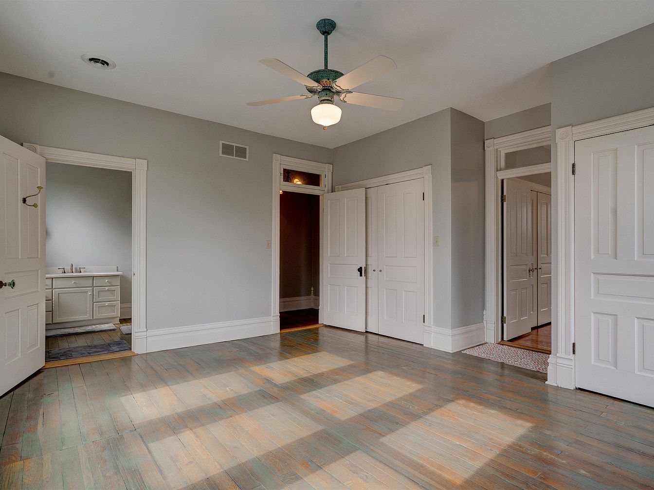 This spacious master bedroom combines classic charm with modern comfort, featuring soft gray walls that create a serene atmosphere. The wide-plank wooden floor, showcasing a mix of natural hues, adds warmth, while ample natural light floods the room, highlighting the clean lines and elegant architectural details. A stylish ceiling fan circulates air, enhancing the cozy feel. Double doors lead to a private vanity area, making mornings effortless. The generous layout offers potential for personalization with furniture arrangements, catering perfectly to family needs. This inviting space is ideal for relaxation, rest, and rejuvenation.