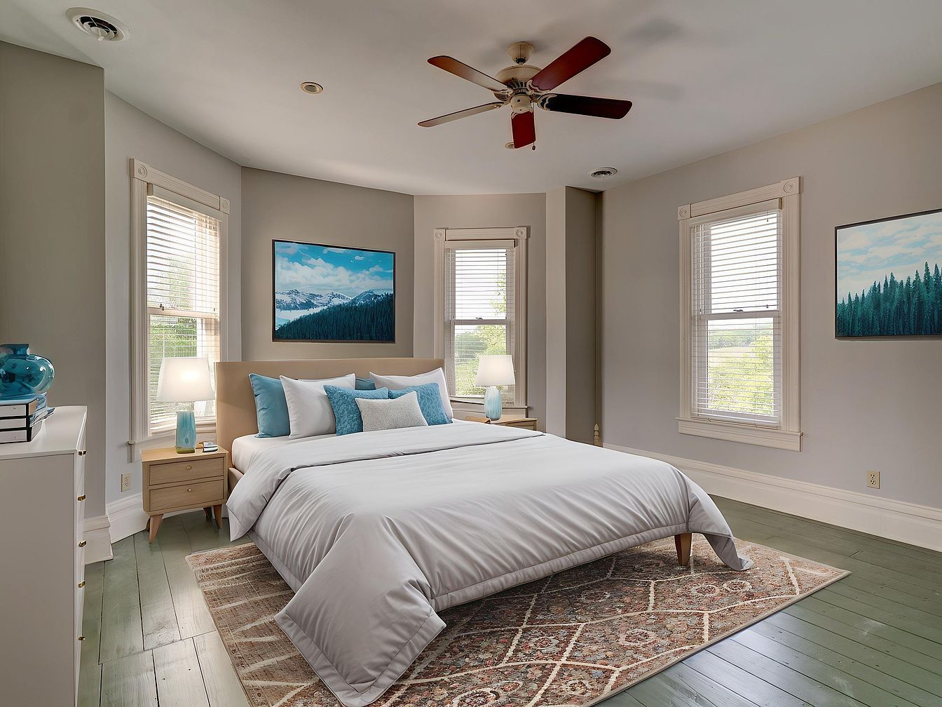 This serene master bedroom combines elegance with comfort, featuring a cozy queen-sized bed dressed in soft neutral linens complemented by plush turquoise accent pillows. The room is bathed in natural light from large windows framed by classic white shutters, enhancing the warm ambiance. A ceiling fan offers a gentle breeze, while the muted grey walls provide a soothing backdrop. Two modern nightstands house stylish lamps, adding functional charm. An eye-catching area rug anchors the space, connecting the rich wood flooring with artful patterns. Framed landscape art completes the look, creating an inviting sanctuary for relaxation.