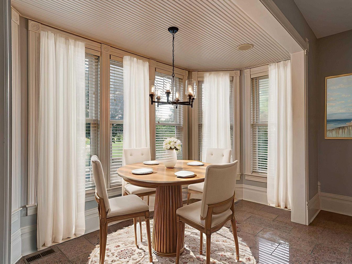 This charming dining room radiates warmth and sophistication with its round wooden table, ideal for intimate family meals. Surrounding the table are plush, light-toned chairs that enhance comfort while maintaining a chic look. The bay windows, framed by soft white drapes, flood the space with natural light and offer views of the lush outdoor landscape, fostering a serene atmosphere. A striking chandelier adds a modern touch to the classic architecture, accentuating the coffered ceiling above. The subtle color palette of soft grays and warm wood tones creates a cohesive, inviting environment, perfect for both casual dining and special occasions.