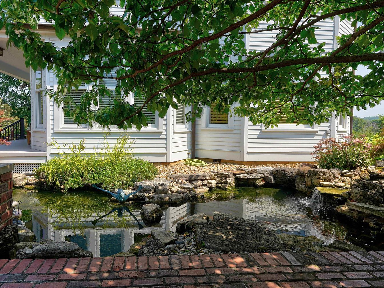 A serene outdoor space showcases a beautifully landscaped backyard, highlighted by a tranquil pond with a gentle waterfall. The lush greenery, framed by the branches of a mature tree, offers a perfect balance of shade and sunlight. Surrounding the pond are smooth rocks and colorful plants, enhancing the natural aesthetic. The home’s white siding reflects classic American architecture, with large windows providing ample light. A brick walkway leads visitors through this inviting area, seamlessly blending nature with thoughtful design. Ideal for family gatherings, this peaceful retreat invites relaxation and connection with the outdoors.