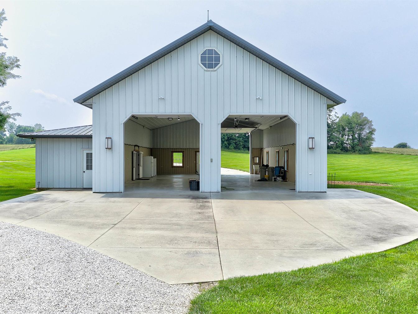 This lovely barn-style exterior combines rustic charm with modern functionality. Its gabled roof and clean lines create a visually appealing silhouette against the expansive greenery. The exterior features a light gray color palette that harmonizes beautifully with the natural surroundings, while large double doors provide ample access and functionality. The surrounding landscape boasts lush, manicured grass, framed by mature trees for a picturesque setting. A spacious concrete driveway leads up to the barn, ideal for family gatherings or events. The thoughtful architecture blends practicality with aesthetic appeal, making it an inviting addition to any countryside property.
