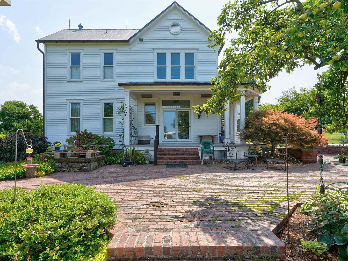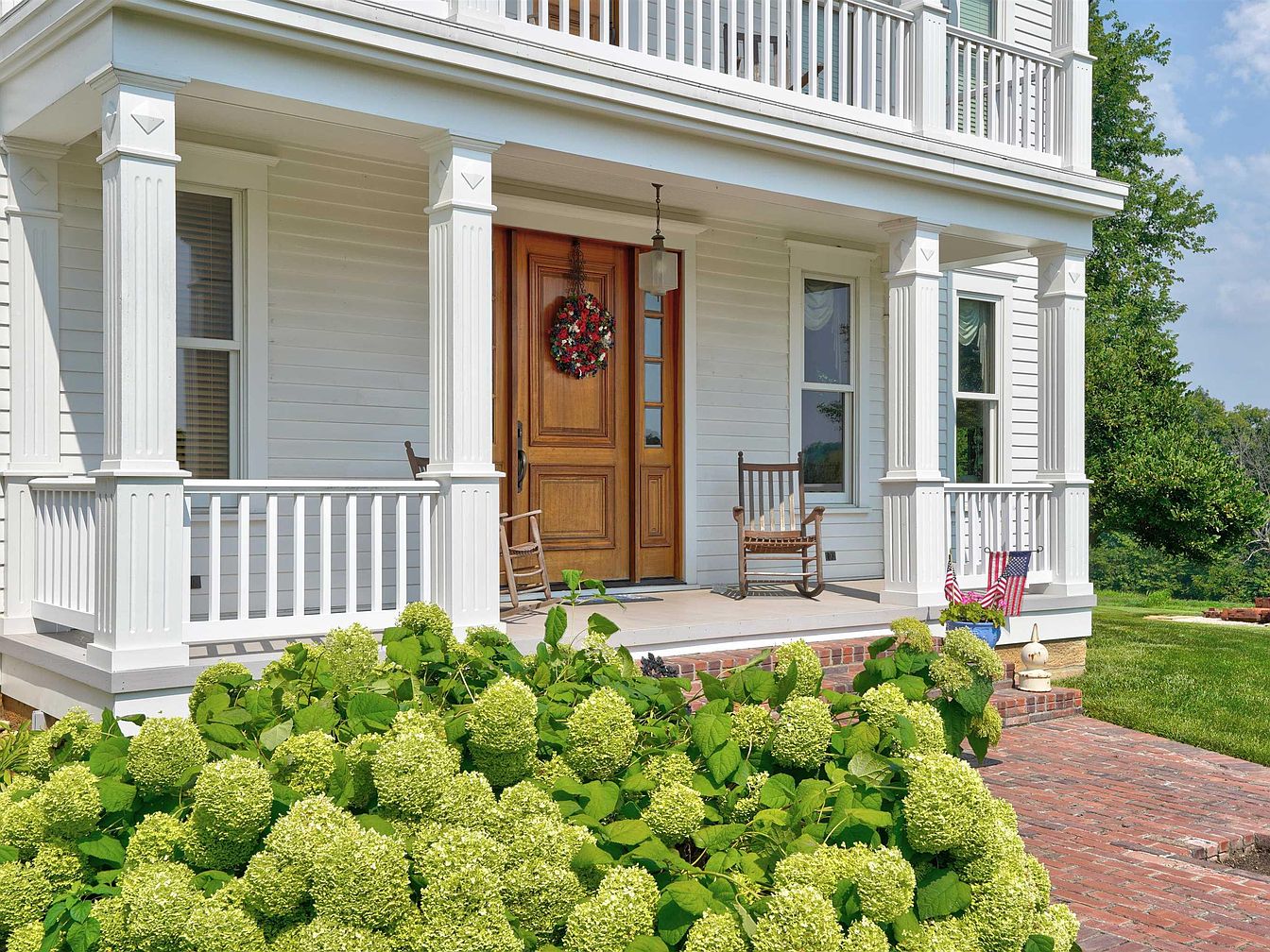 This inviting entryway features a beautifully maintained brick pathway leading to the front porch of a classic American home. The white siding contrasts elegantly with the lush green landscaping, including well-tended shrubs and seasonal flowers that provide vibrant splashes of color. Traditional architectural details such as the welcoming porch with columns invite relaxation, while the assortment of outdoor furniture encourages social gatherings. Family-friendly elements are highlighted by the spacious layout, allowing children to play safely in the yard. The harmonious blend of nature and home creates a tranquil retreat, perfect for enjoying sunny days and starry nights.