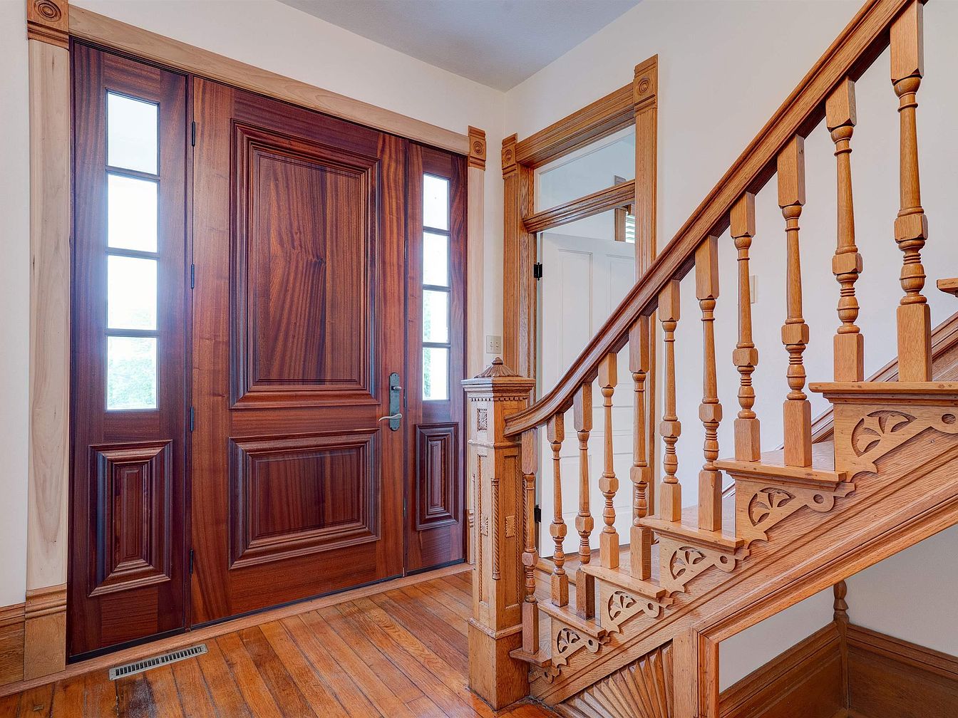 A stunning entrance hallway welcomes visitors with its rich wooden elements and intricate craftsmanship. The grand double door, adorned with decorative panels and sidelights, invites natural light to flow in, enhancing the warmth of the space. The elegant staircase, featuring beautifully turned balusters and carved details, ascends gracefully to the upper levels. Rich hardwood flooring complements the deep hues of the entryway, while the neutral wall color offers a serene backdrop. This well-designed foyer is both functional and inviting, creating a perfect first impression with family-friendly features that encourage easy movement and connectivity.