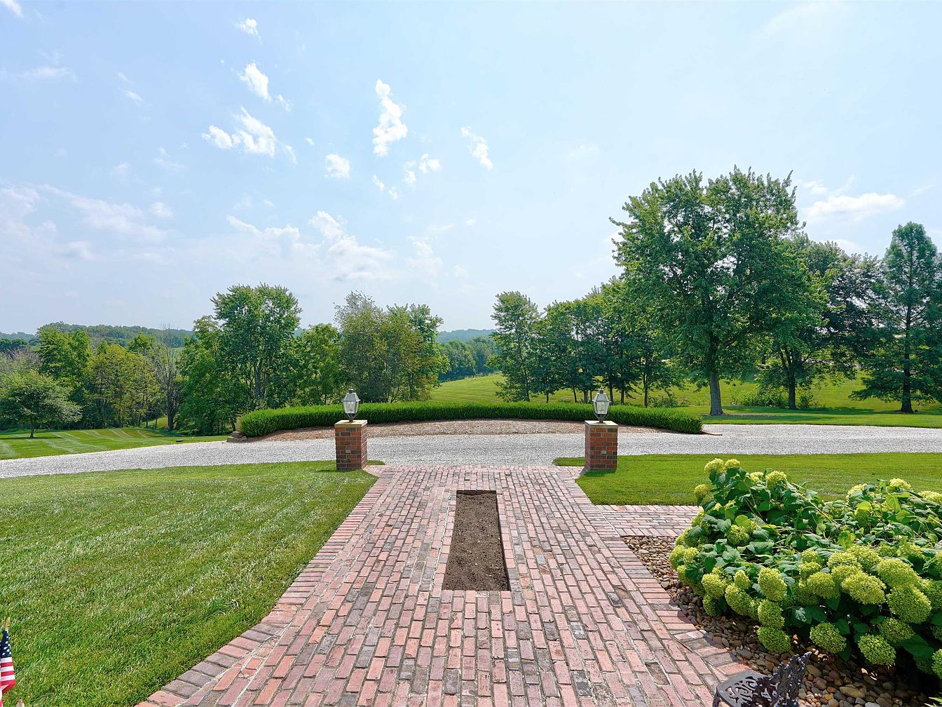 This inviting front entryway seamlessly blends traditional charm with natural beauty. A well-maintained brick pathway leads to the entrance, bordered by lush green lawns, creating an inviting approach. On either side, elegantly placed brick columns support lanterns, adding a touch of sophistication. The expansive, manicured landscape provides a picturesque backdrop with gentle rolling hills and vibrant trees, making it perfect for outdoor family gatherings. The soothing color palette of greens and earthy tones enhances the serene ambiance. A thoughtfully designed flower bed features delicate hydrangeas, offering a delightful visual contrast and a warm welcome to all who arrive.