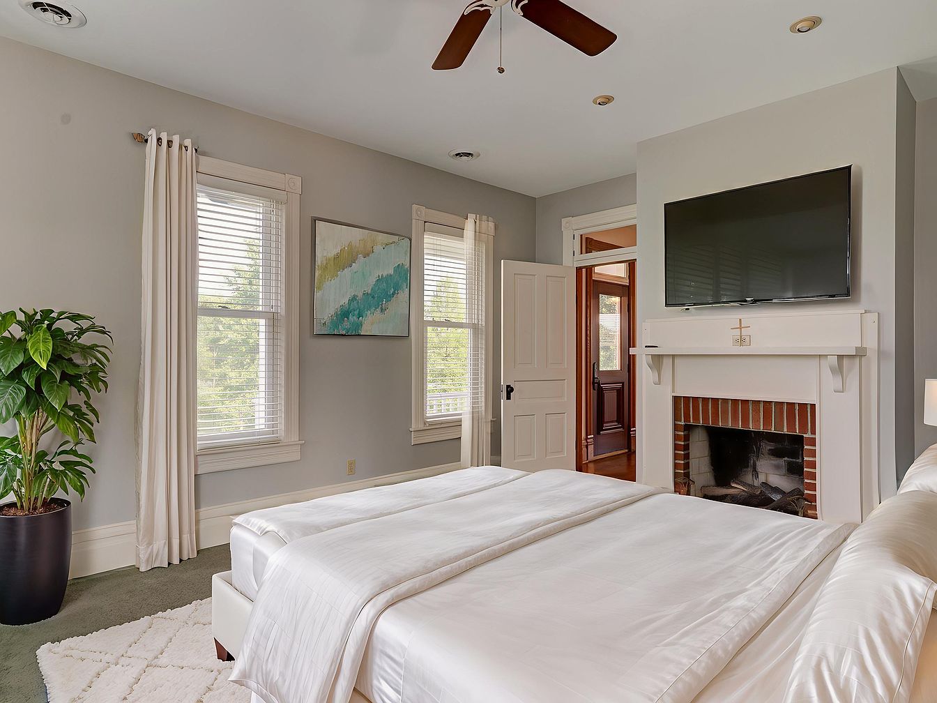 This serene master bedroom integrates contemporary comfort with classic charm. The plush green carpet complements soft gray walls, creating a soothing atmosphere. Large windows, adorned with elegant cream curtains, allow natural light to fill the space, enhancing its airy feel. A modern fireplace framed in white offers both warmth and a cozy focal point, while the carefully positioned television provides entertainment without detracting from the room’s tranquility. The minimalist decor is accented by tasteful artwork, featuring calming blues and greens. This functional yet inviting space is perfect for relaxation, making it ideal for families seeking a peaceful retreat.