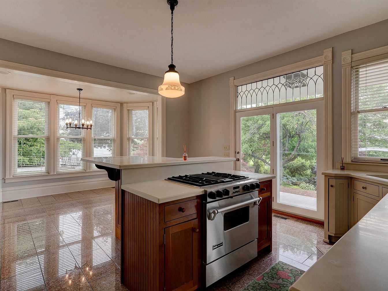 This inviting kitchen combines modern functionality with timeless elegance. The spacious layout includes a central island that fosters family gatherings, complemented by a stylish gas stove. Natural light floods the room through large windows, enhancing the fresh atmosphere with views of the lush greenery outside. Subtle gray walls harmonize with rich wooden cabinetry, accented by gleaming granite countertops. The polished tile floor reflects the warm tones, adding a luxurious touch. Architectural details like decorative moldings and a charming chandelier contribute to the homey, sophisticated ambiance, making it a perfect space for both cooking and connection.