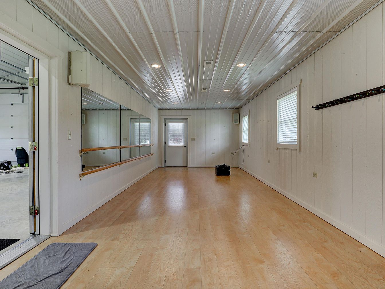 This dance studio features clean lines and an open layout, creating an inviting atmosphere. The light wooden flooring complements the white paneled walls, enhancing the sense of spaciousness. Natural light floods the room through the windows, promoting an energetic vibe. A full-length mirror alongside a wooden ballet bar provides functionality for dancers of all levels. The ceiling is outfitted with bright recessed lighting, ensuring the space is well-lit during practice. Family-friendly elements include easy-to-clean surfaces and ample room for activities, making it perfect for both children and adults to engage in creative movement.