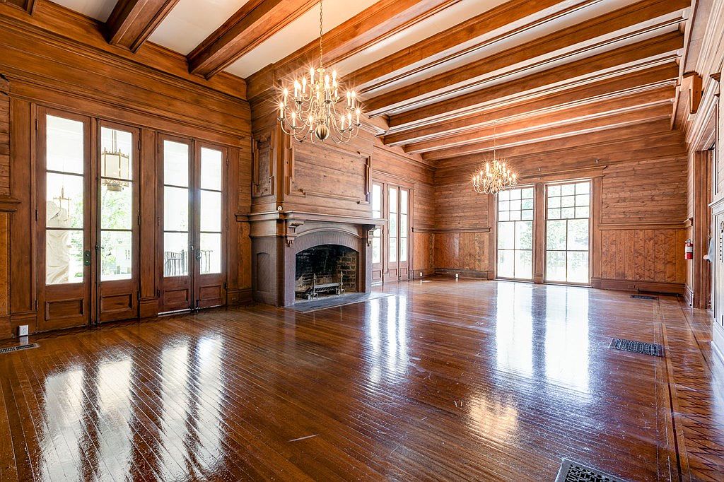 This expansive living room features rich wooden paneling and ceiling beams, exuding classic charm and warmth. The room is anchored by a grand fireplace, creating a cozy focal point for gatherings. Large windows flood the space with natural light, highlighting the polished hardwood floors that reflect the elegant chandelier above. An open layout ensures flexibility for family activities, while the neutral color palette enhances serenity. Multiple seating arrangements can be easily integrated to foster an inviting atmosphere. Period architectural details blend with modern comforts, making this room perfect for entertaining or quiet family evenings.