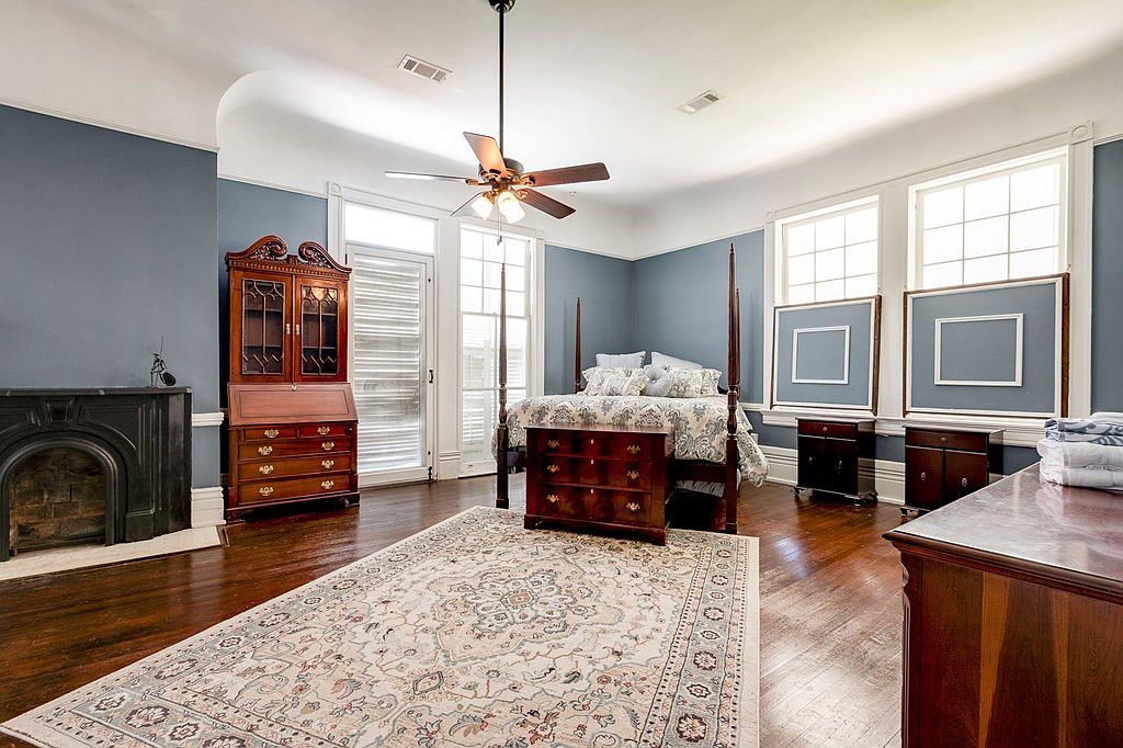 This spacious master bedroom boasts a soothing blue color scheme that elegantly contrasts with the rich hardwood flooring. A beautifully crafted four-poster bed, adorned with floral bedding, serves as the room’s centerpiece. Antique furniture pieces, including a polished dresser and an ornate cabinet, enhance the room’s charm while offering ample storage. The high ceiling is complemented by a stylish ceiling fan that ensures comfort during warmer months. Multiple large windows allow natural light to flood in, creating a bright and inviting atmosphere. The room’s classic architectural details, such as crown molding and paneling, add a touch of sophistication.