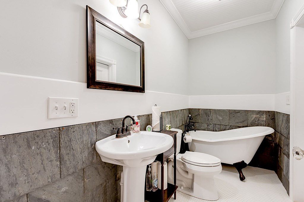 This inviting bathroom features a harmonious blend of modern elegance and classic charm. A beautifully freestanding bathtub invites relaxation, complemented by a chic pedestal sink and polished fixtures. The walls showcase a soothing pale gray hue, perfectly contrasted by the rich slate tile wainscoting, adding texture and sophistication. Soft lighting from the dual sconces casts a warm glow, enhancing the tranquil ambiance. Family-friendly design elements, such as ample storage options and accessible features, cater to everyday needs. The sleek layout maximizes space while maintaining an uncluttered flow, creating a serene environment ideal for rejuvenating moments.