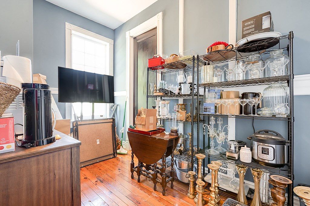 This utility room combines functionality with charm, featuring a mix of modern appliances and decorative storage. The light gray walls create a soothing backdrop, while the natural wood flooring adds warmth. A sturdy wooden table provides surface space for sorting and organizing, complemented by a sleek black shelving unit displaying an array of glassware and kitchen gadgets. Large windows allow ample natural light, enhancing the airy feel. Family-friendly touches include easy-to-access storage and a variety of items displayed for convenience, making this room not only practical but also a reflection of a well-lived life.