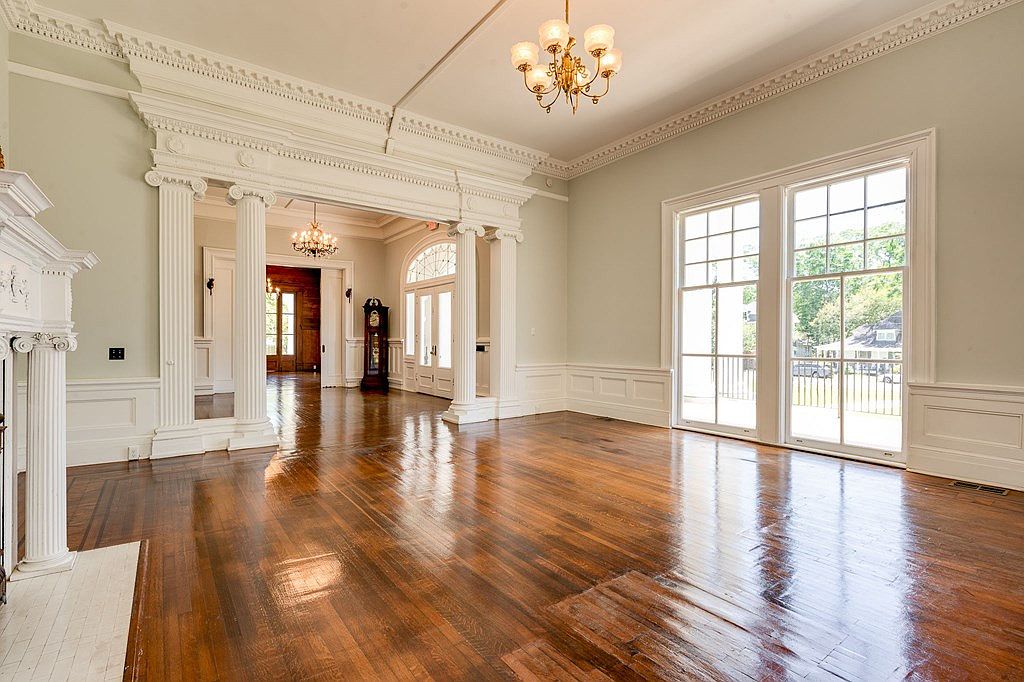 This spacious grand entryway features elegant architectural details, highlighted by tall columns and exquisite crown molding. Wood paneling introduces warmth, complementing the rich, polished hardwood floors that glisten under natural light. The light, muted wall color enhances the brightness of the space, while large windows allow for ample sunlight, creating an inviting atmosphere. A stunning chandelier hangs from the ceiling, adding a touch of sophistication. The open layout seamlessly connects to other areas of the home, promoting family interaction. Ideal for gatherings, this entryway embodies both classic style and modern functionality, making it a welcoming focal point of the home.