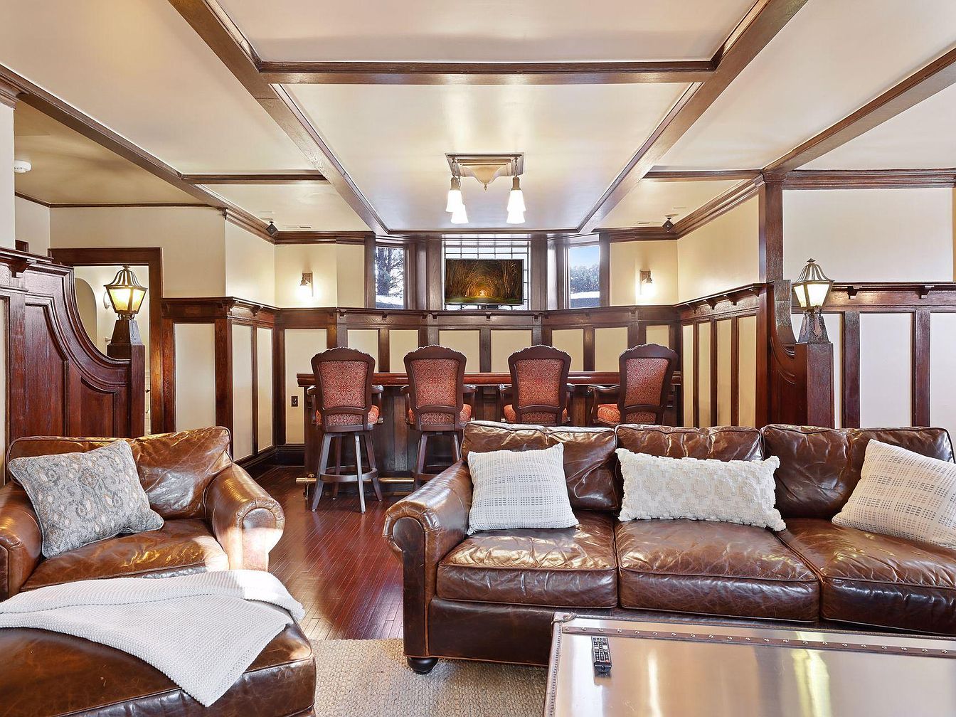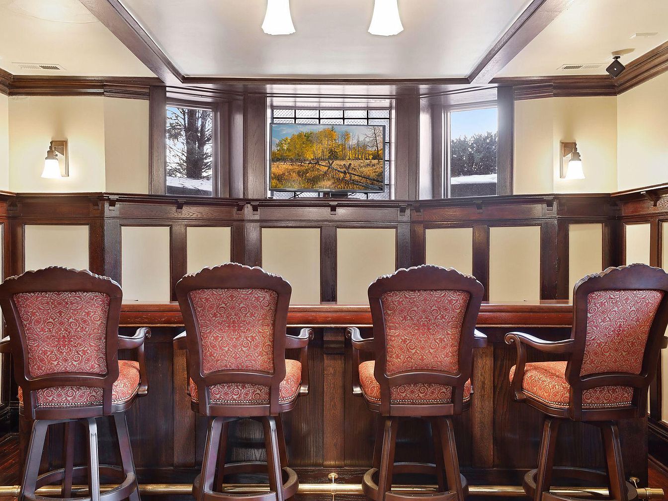 This inviting home bar area features a rich, craftsman-inspired design with deep wood paneling and classic trim that create an air of timeless sophistication. Four ornate bar stools, upholstered in a warm red patterned fabric, provide comfortable seating for family or guests, making it a perfect spot for gatherings or casual meals. The room is well-lit with ceiling and wall sconces, enhancing the warm, welcoming atmosphere. A leaded glass window with a scenic view adds a unique architectural feature, while the overall neutral and earthy color palette complements the traditional aesthetic and ensures versatility for family use.