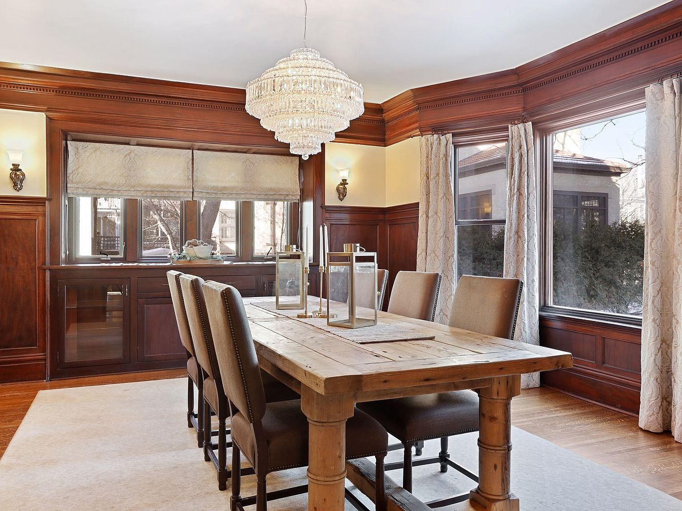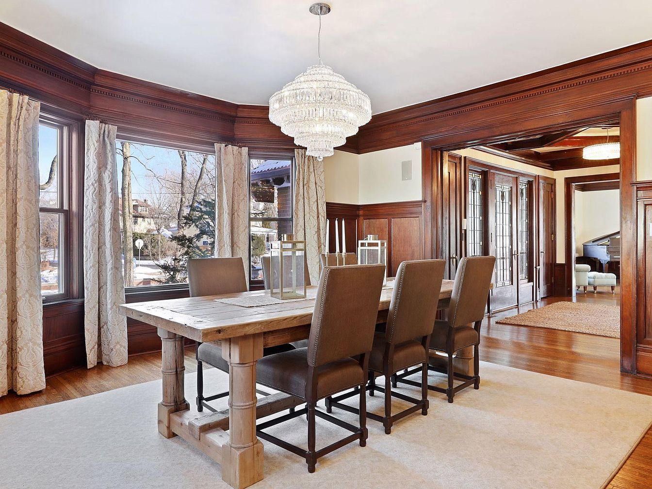 A striking formal dining room features rich wood paneling and intricate crown molding, creating a warm, inviting ambiance for family gatherings and special occasions. Large windows with floor-length drapes allow natural light to flood the space, highlighting the rustic wooden dining table and comfortable upholstered chairs that can easily seat eight. The centerpiece chandelier adds a touch of glamour, while the pale area rug softens the hardwood floors and makes the room kid-friendly. Glass-panel double doors lead to an adjoining room, extending the entertainment space, while subtle cream-toned walls balance the room’s darker wood elements and create a timeless, sophisticated look.