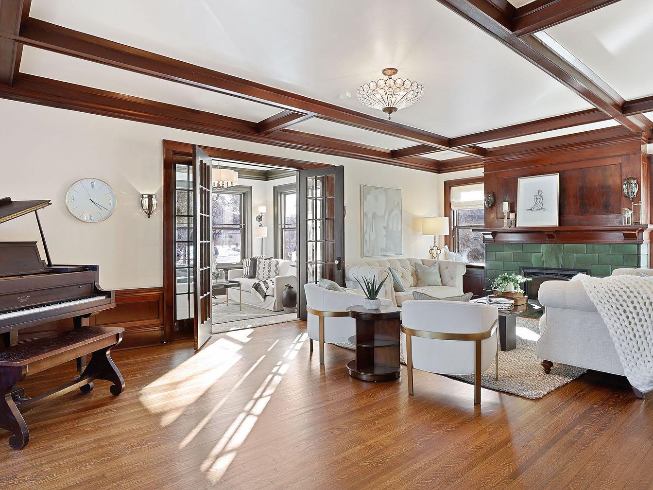 Spacious living room featuring rich wood beams and trim, complemented by a statement green tile fireplace for a warm, inviting atmosphere. Plush white sofas, accent chairs with gold detailing, and a textured rug create a cozy setting perfect for gatherings. A grand piano in the corner adds a touch of elegance and hints at family musical moments. Double glass doors open to an adjoining sitting area, enhancing the sense of openness and natural light. Neutral walls and contemporary artwork balance the classic architectural elements, while family-friendly furnishings ensure both comfort and sophistication for daily living or entertaining guests.