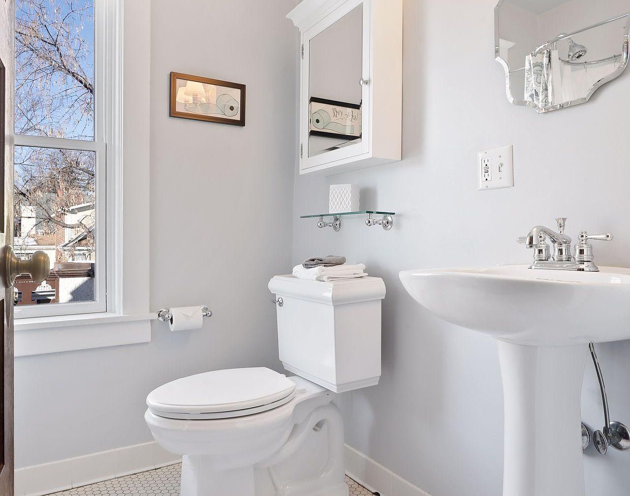 A fresh and inviting bathroom corner features a crisp white pedestal sink and matching toilet, complemented by chrome fixtures and a sleek wall-mounted mirror. The natural light streams through a large window, creating a bright and airy atmosphere ideal for family use. Soft gray walls add subtle warmth, while classic hexagonal floor tiles evoke timeless elegance. Wall-mounted cabinets and a glass shelf provide practical storage for toiletries and neatly folded towels, ensuring the space remains organized and clutter-free. Thoughtful touches such as framed artwork and a textured tissue box bring personality and charm to this well-designed, functional space.
