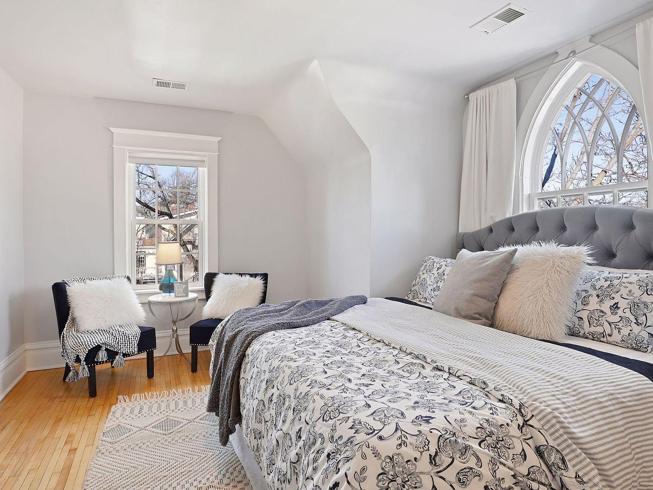 A bright and airy bedroom combines classic architecture with modern comfort, featuring a large tufted headboard against an elegant arched window that fills the space with natural light. Soft white and gray tones dominate the room, complemented by botanical-patterned bedding and plush throw pillows for a welcoming feel. The light hardwood flooring and textured area rug create warmth underfoot, while a reading nook with two stylish chairs and a small round side table provides a perfect spot for relaxing or spending family time together. The calming palette and thoughtfully chosen furnishings make this space ideal for rest and connection.