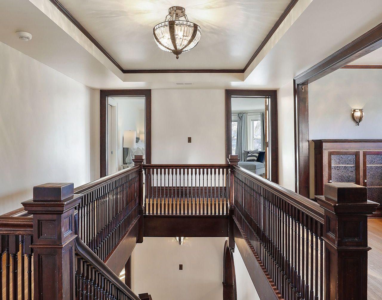 A spacious upstairs hallway features rich, dark wood railings and trim that contrast beautifully with warm, neutral wall tones. The wide corridor allows easy movement between rooms, ideal for family homes where accessibility and safety are key. Ample natural light streams in from the adjacent rooms, creating a bright and welcoming atmosphere. A modern chandelier suspended from a tray ceiling adds a touch of elegance. The transitional layout connects private bedrooms and living spaces seamlessly, offering both privacy and connection for family members. Tasteful details like classic woodwork and soft lighting accentuate this versatile and timeless space.