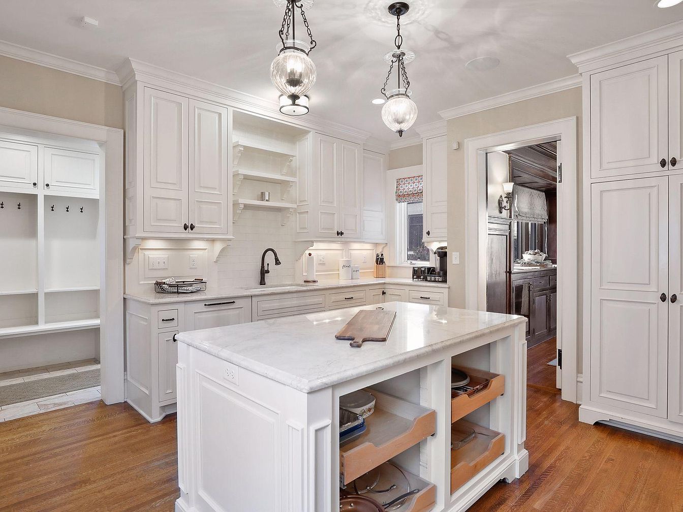 This inviting kitchen offers a spacious and airy layout with classic white cabinetry and a large center island. The marble countertop island features open shelving with pullout wooden drawers, perfect for easy access to family meal essentials and keeping kids organized. Ample cabinetry surrounds the space, while under-cabinet lighting and glass pendant lights add warmth and elegance. High ceilings and soft neutral walls create an open feel, and the hardwood floors provide a touch of natural charm. The thoughtful design includes a mudroom area with cubbies and hooks, making the space highly functional for busy family routines.