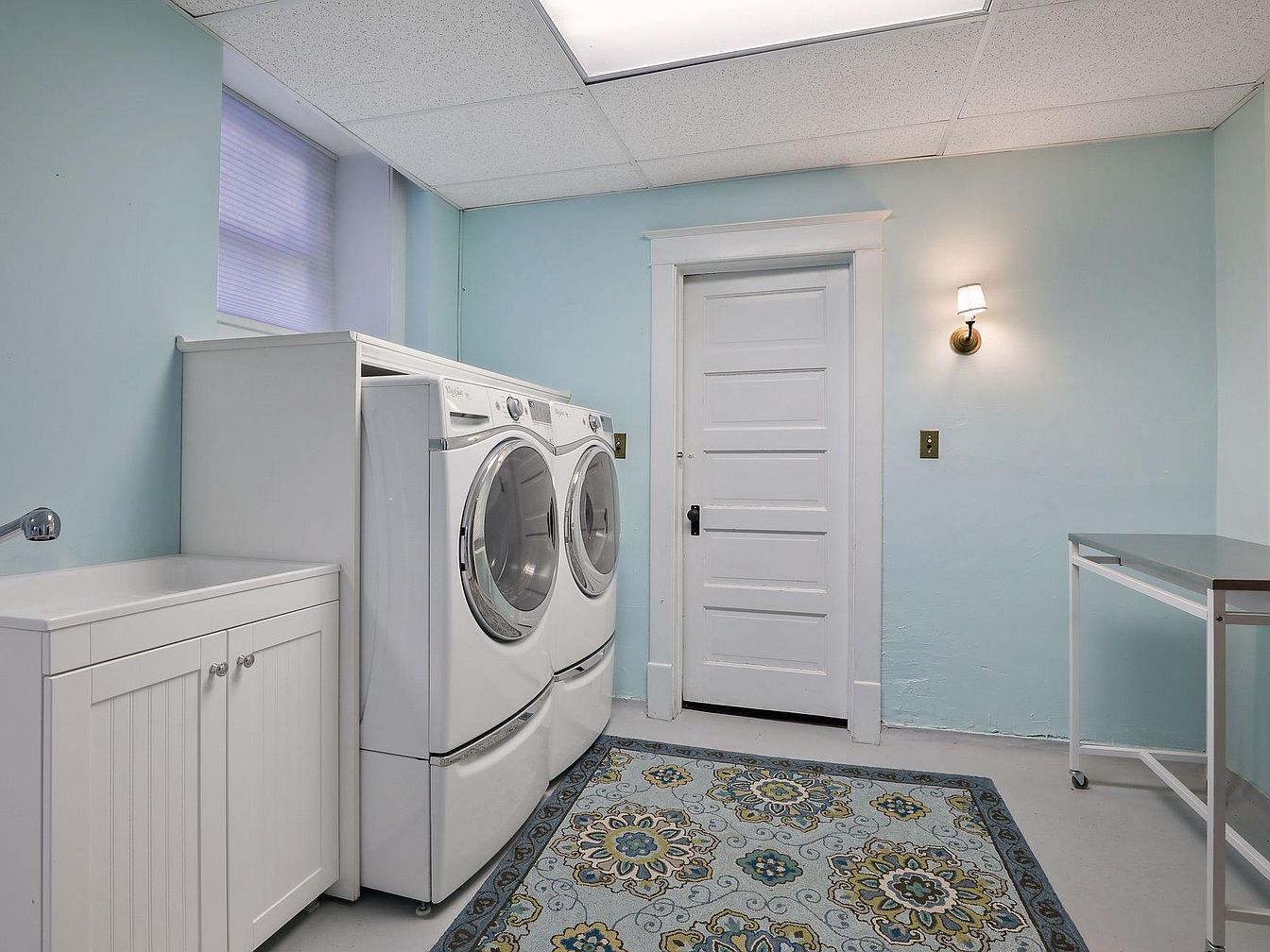 A bright and inviting laundry room designed with both practicality and comfort in mind. The space features soft pastel blue walls that create a calming atmosphere, complemented by a large, patterned area rug that adds warmth and style. Front-loading washer and dryer units stand side by side, ideal for family laundry needs. A convenient utility sink with built-in cabinetry allows for easy pre-wash treatments or clean-up, while a clean white folding table on wheels provides flexibility for sorting and folding clothes. Warm overhead lighting and a wall sconce offer ample illumination, and wide baseboards and door trim enhance the room’s traditional American charm.