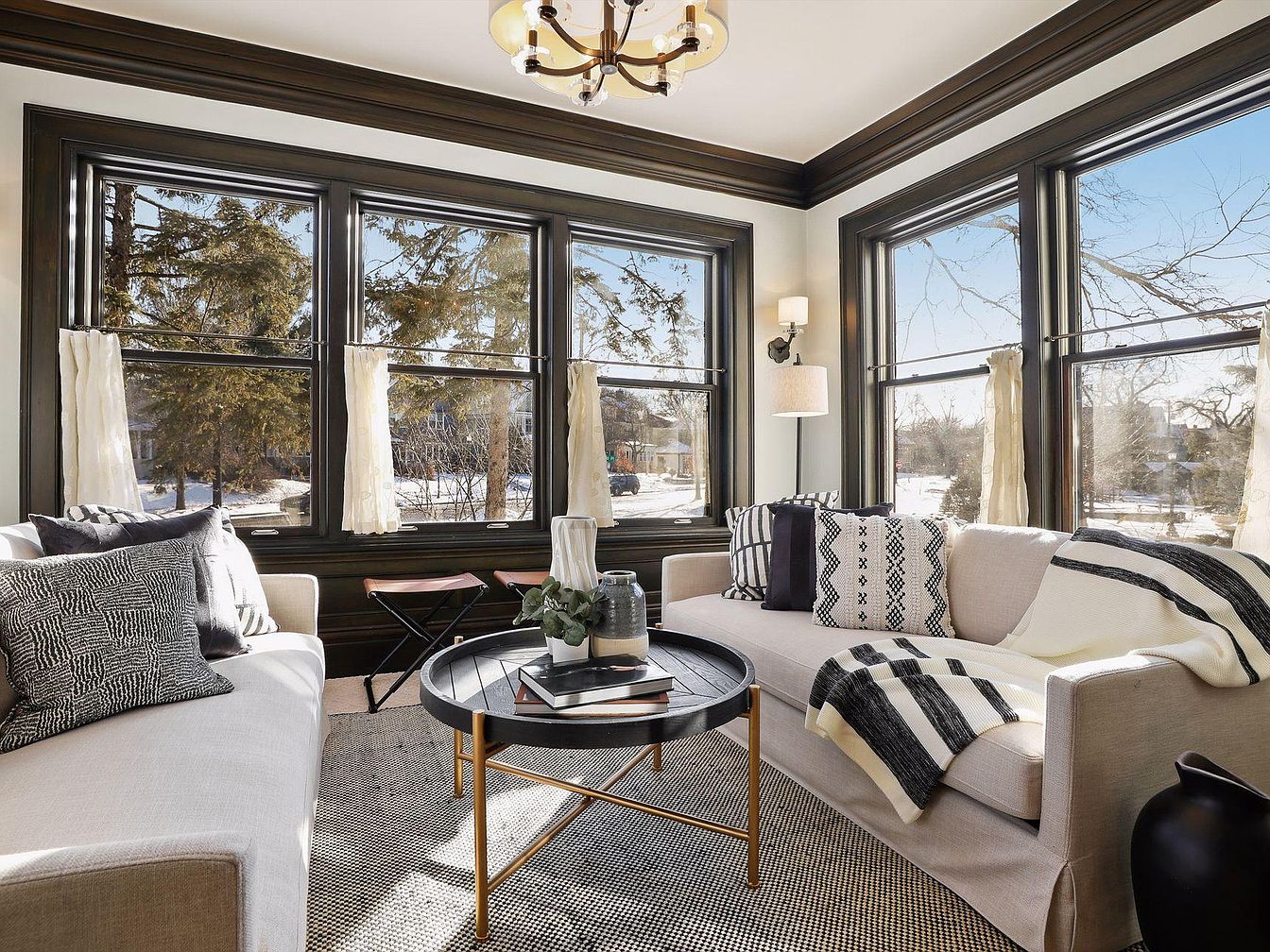 A bright and inviting living room corner showcases two contemporary sofas arranged to foster conversation and relaxation, perfect for both family gatherings and quiet moments. Floor-to-ceiling windows with dark wood trim flood the space with natural light, offering stunning outdoor views and making the room feel airy and open. Soft monochromatic tones dominate the palette, with cream sofas, black and white patterned pillows, and a cozy striped throw. A sleek black round coffee table sits central on a textured rug, providing a practical yet stylish touch. Subtle accent lighting and thoughtful decor complete the tranquil and welcoming ambiance.