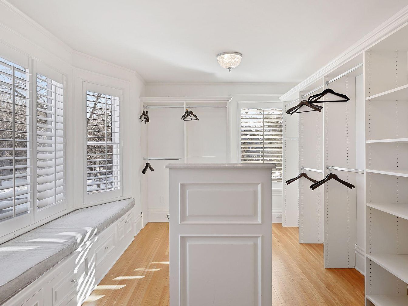 This spacious walk-in closet offers a bright and airy layout with ample natural light streaming through large windows fitted with elegant white shutters. Custom built-in cabinetry provides extensive storage with open shelving and hanging rods on either side, perfect for organizing clothing and accessories for the entire family. A central island adds countertop space for folding or arranging outfits, while a cozy window bench with drawers below doubles as a seating area and extra storage. The white-on-white color scheme, accented by warm hardwood floors, creates a clean, timeless look that feels inviting and organized for everyday use.