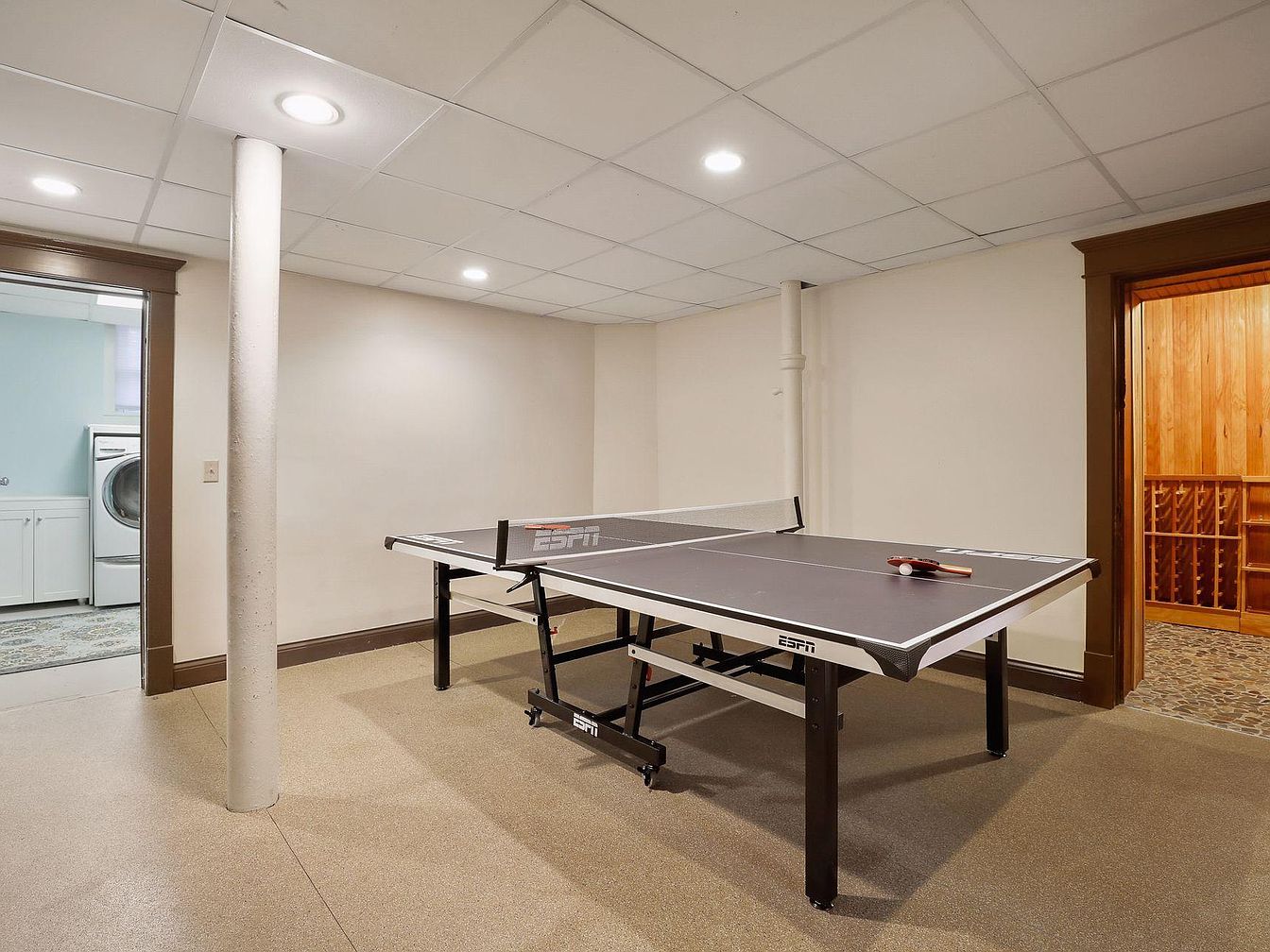 A spacious basement game room designed for family fun and entertainment features a modern ping pong table at its center, inviting friendly competition. The neutral color palette enhances the sense of openness, while recessed lighting and a grid-patterned ceiling create a bright, inviting atmosphere. Durable flooring and wide, open layout make this space perfect for gatherings, accommodating both children and adults. Visible through open doorways are a convenient laundry area with stacked appliances and a cozy wood-paneled section, possibly a wine cellar or storage nook, which adds functional versatility to this multi-purpose, family-friendly basement retreat.