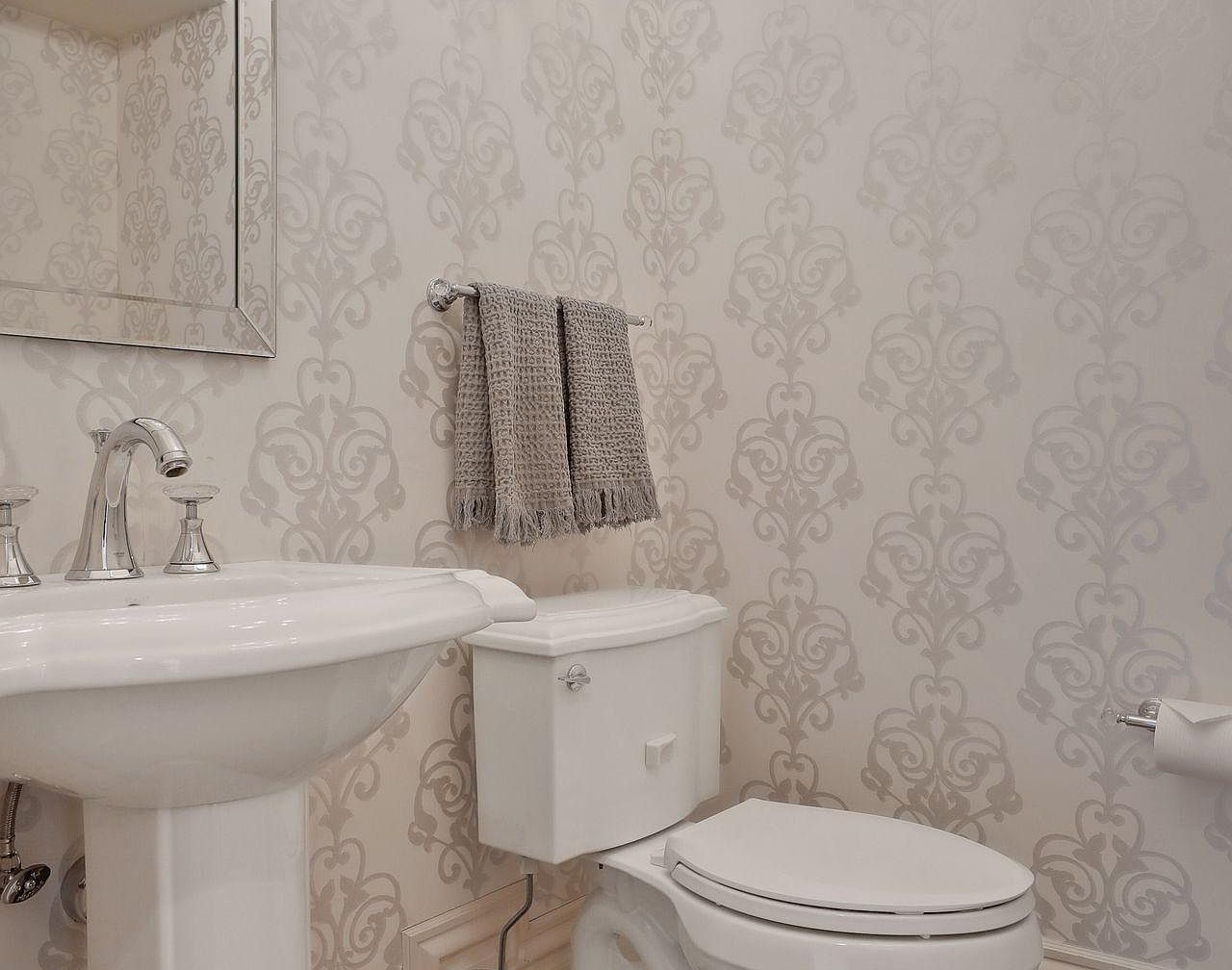 A stylish powder room showcases an elegant blend of functionality and refinement, perfect for family use and guest comfort. The pedestal sink features graceful lines and chrome fixtures, harmonizing with the classic contours of the toilet. Soft gray damask-patterned wallpaper adds depth and a touch of luxury, while a metallic-framed mirror enhances the sense of light and space. The neutral color palette, featuring whites and subtle silvers, creates a calming atmosphere, and a textured gray hand towel is conveniently hung for accessibility. Thoughtful placement of accessories and easy-to-clean finishes make this space both welcoming and practical for households of all sizes.