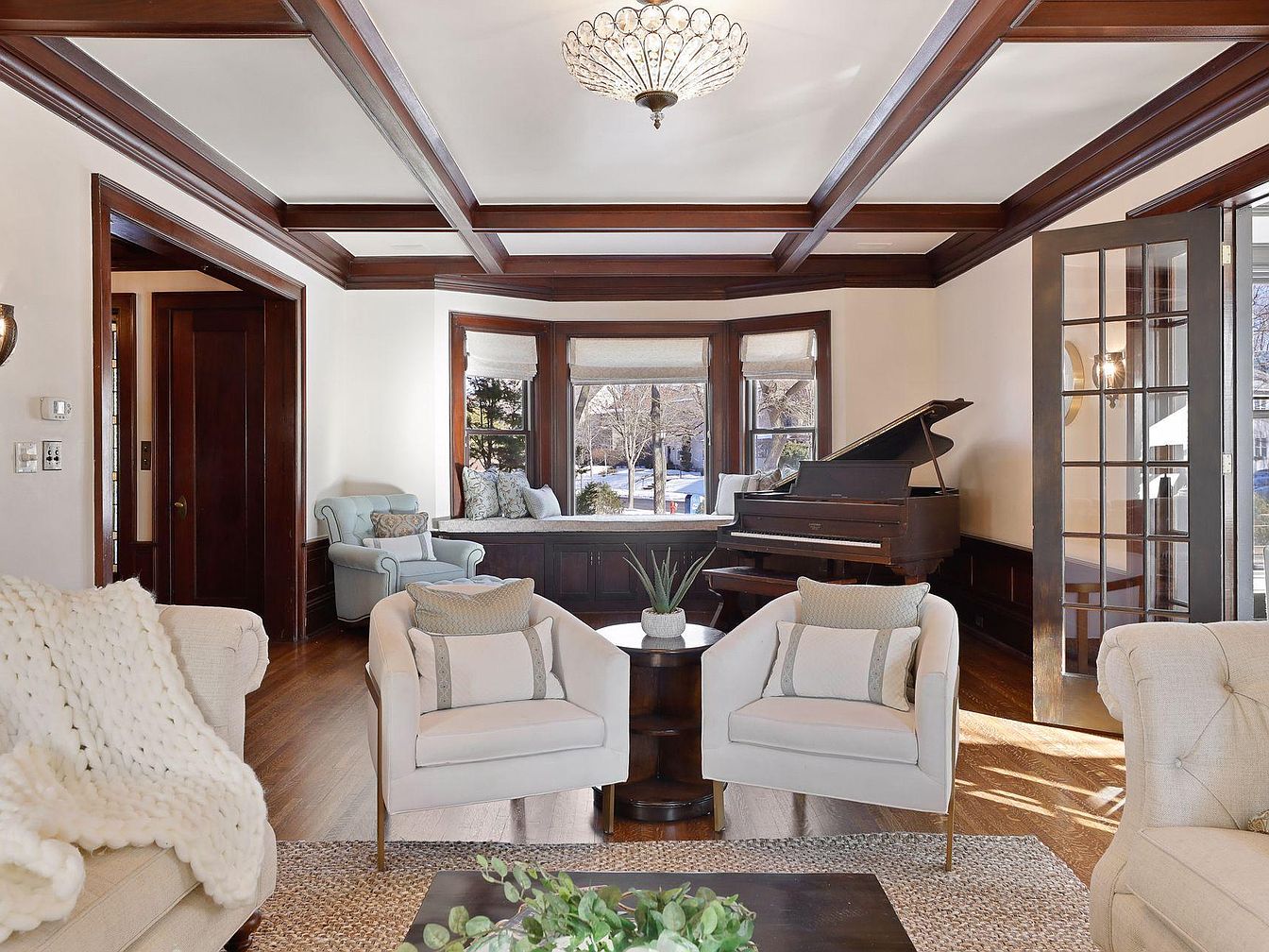 A spacious, elegant living room is anchored by a grand piano beside a bright bay window, which features a cozy window seat perfect for family reading or relaxation. The coffered ceiling with dark wood beams adds architectural charm, while warm wood trim frames the French doors for an inviting entrance. Soft, neutral-toned furniture including plush sofas and armchairs, paired with textured pillows and a light knit throw, invite comfort and conversation. A gentle palette of cream, beige, and light blue enhances the space’s warmth, while sunlight pours in, highlighting the room’s open, family-friendly layout.