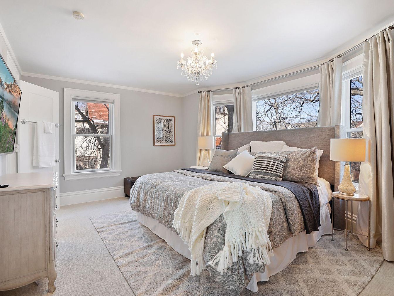 This spacious master bedroom exudes comfort and elegance with its soft, neutral color palette and abundant natural light streaming through large, wraparound windows. A plush, patterned area rug anchors the room, complementing the light carpeting and adding cozy texture underfoot. The grand upholstered bed, layered with textured pillows and a warm throw, invites relaxation. Family-friendly details include durable, easy-to-clean fabrics, rounded nightstands for safety, and blackout curtains for restful sleep. A crystal chandelier adds a touch of sophistication, while ample room for movement ensures both style and practicality for a family-oriented home.
