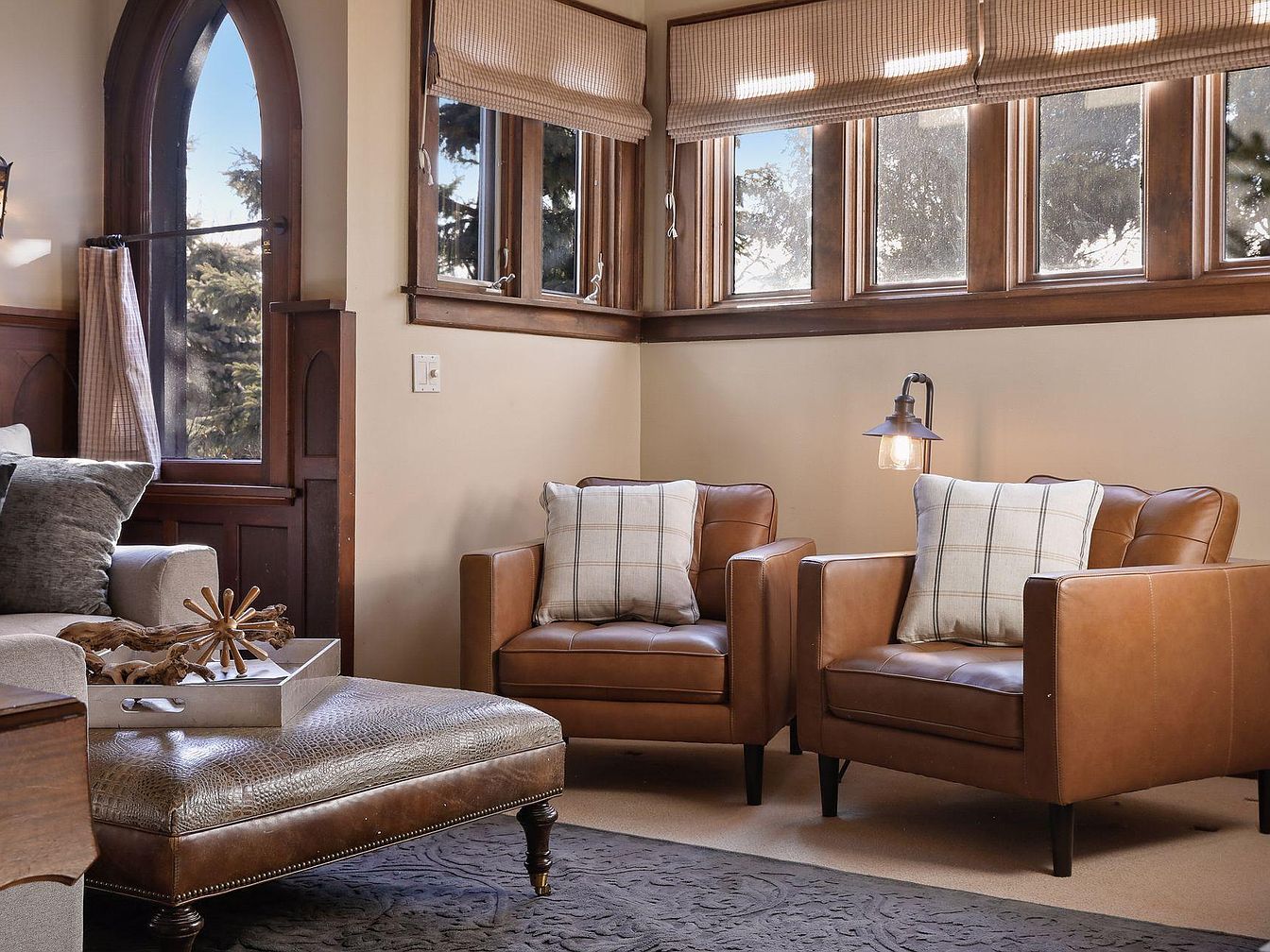 A cozy nook in the living room blends comfort with elegance, featuring two caramel leather armchairs accented by plush plaid pillows—perfect for family conversations or reading time. Natural light pours in through multiple windows framed with rich wood trim and warm roman shades, enhancing the inviting ambiance. A tufted leather ottoman serves as both a coffee table and extra seating for gatherings, while the nearby soft gray sofa adds seating flexibility. The soft neutral tones and tasteful decor, including a sculptural tray centerpiece, make this space ideal for relaxing with loved ones or enjoying quiet afternoons.