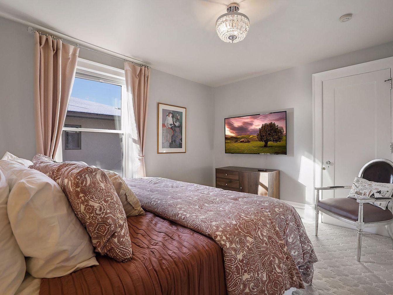 A welcoming and tranquil bedroom features soft gray walls and crisp white trim, accentuated by an elegant crystal chandelier. Natural light streams in through a broad window dressed in blush-pink curtains, creating a bright and inviting atmosphere. The bed, dressed in rich, paisley-patterned bedding in earthy tones, invites relaxation and comfort, while plush pillows add to the room’s cozy vibe. Opposite the bed, a wall-mounted flat-screen TV sits above a modern wood dresser, perfect for family movie nights or unwinding at the end of the day. An upholstered armchair with a whimsical cushion offers extra seating, making the space both stylish and family-friendly.