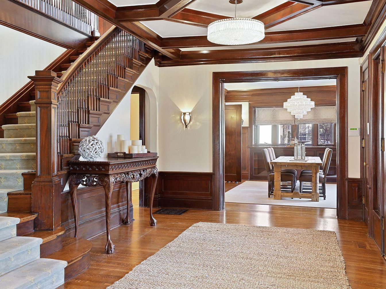 Grand double doors open into an elegant entryway featuring rich hardwood floors, intricate wood-paneled walls, and a show-stopping coffered ceiling stained to match the stately staircase. A luxurious runner softens each step, making it safe for children and guests. The carved wood console table is decorated with a cluster of candles and modern art, providing both style and a welcoming glow. Cleverly placed lighting brightens the space while a crystal chandelier offers a touch of formality overhead. Through a wide doorway lies an inviting dining area, perfect for family meals and gatherings, continuing the warm, cohesive color palette.