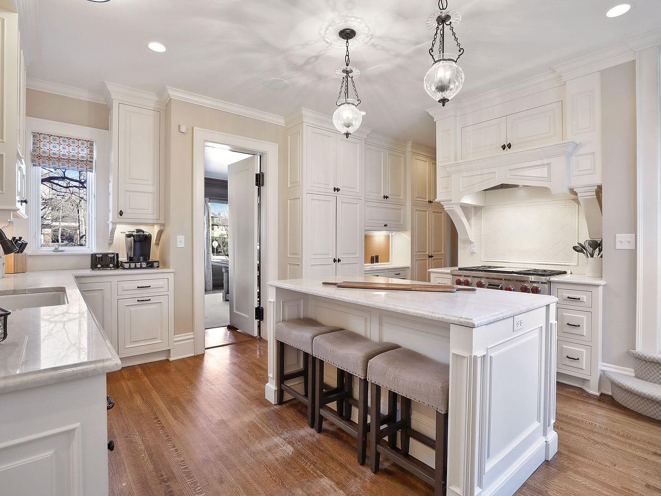 A spacious, light-filled kitchen features a large central island with three upholstered stools, creating a welcoming space for casual family gatherings or kids’ homework time. Crisp white cabinetry extends to the ceiling, offering ample storage and a touch of elegance, while functional, easy-to-clean marble countertops cater to everyday life. Warm hardwood floors add natural contrast to the soft beige walls and cabinetry, making the space feel cozy and inviting. Modern globe pendant lights provide a stylish focal point, and large windows bring in plenty of natural light, making the kitchen both functional and family-friendly.