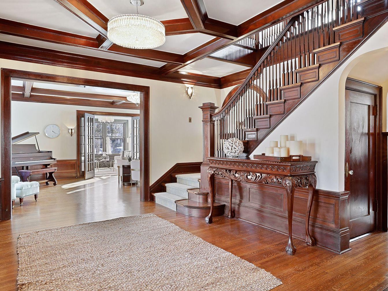 A welcoming grand foyer featuring stunning wooden architectural details, including an ornate staircase and paneling. The bright, spacious layout highlights a coffered ceiling and gleaming hardwood floors that flow into adjacent rooms. Decorative lighting casts a warm glow, while a hand-carved console table and tray of pillar candles add elegance. The large natural fiber rug provides comfort and safety for families, inviting children to sit or play. This entryway sets a classic yet cozy tone, seamlessly connecting to a music room with a grand piano and bright sitting area, all bathed in abundant natural light from wide windows.