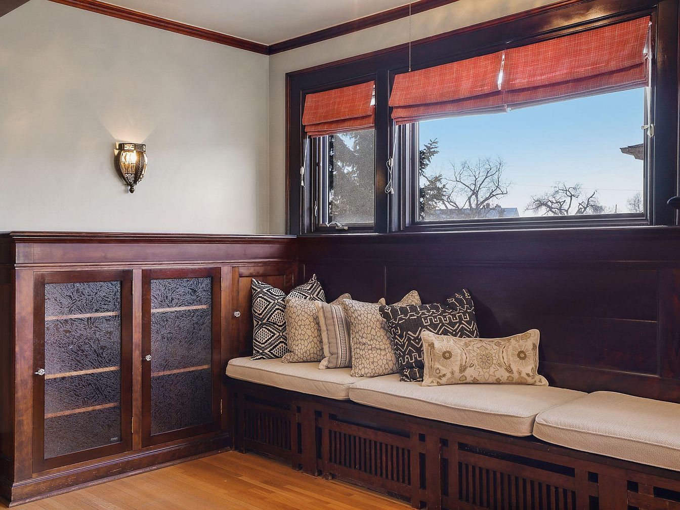A cozy built-in window seat creates an inviting nook ideal for reading, relaxing, or enjoying morning sunlight. The space is framed by rich dark wood paneling and window trim, offering a sense of warmth and timeless character. Cushioned seating with an array of decorative patterned throw pillows adds comfort and visual interest, making it perfect for families or guests to gather. Overhead, large windows flood the area with natural light, while opaque cabinet doors below the seat provide hidden storage for books, games, or toys. The warm wood tones and soft textiles complement the neutral wall color and gently glowing sconce, balancing elegance and casual comfort.