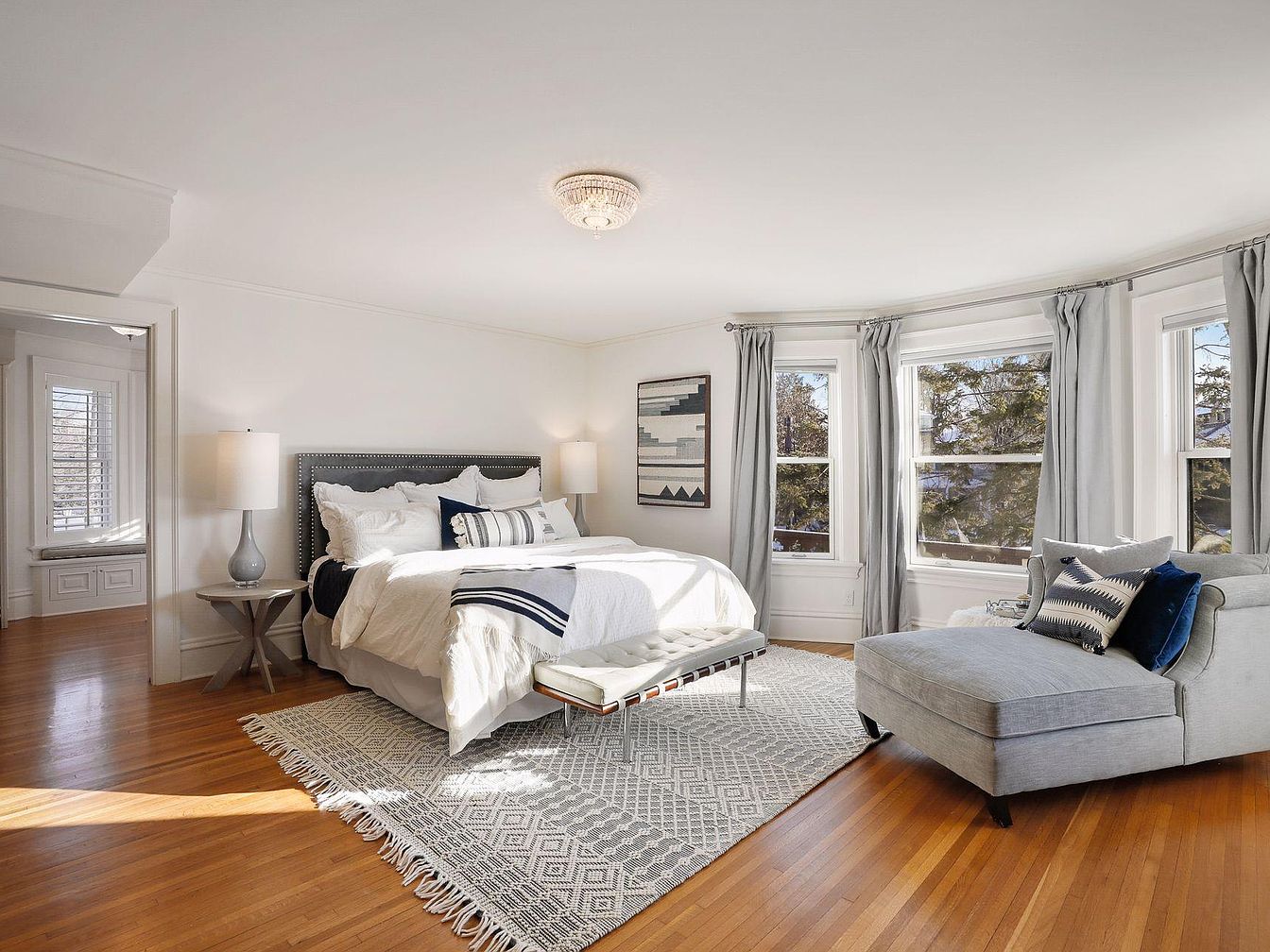 This spacious master bedroom features an inviting layout with abundant natural light pouring in through three large, curved windows framed in soft gray drapes. The room balances warmth and elegance, with light hardwood floors and a geometric area rug anchoring a plush queen-sized bed decked in crisp white linens and navy accent pillows. A cozy chaise lounge by the windows creates an ideal spot for relaxation or family reading time. Subtle wall art, matching bedside lamps, and minimalist furniture enhance the calming, neutral color palette, making this space both stylish and family-friendly. The adjoining area features a charming window seat, perfect for children or quiet moments.