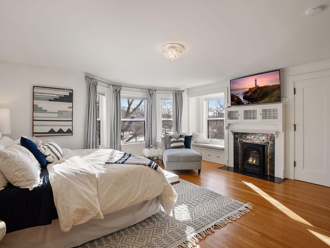 A spacious and airy master bedroom features crisp white walls complementing natural hardwood floors, creating a calm and inviting atmosphere. A plush, king-sized bed adorned with textured pillows and cozy bedding is perfectly positioned to catch natural light from the triple bay windows. An elegant sitting area with a chaise lounge and built-in window seat offers a perfect reading nook or space to relax as a family. The fireplace, finished with mosaic tiles and a classic white mantel, adds warmth and visual interest, while a wall-mounted TV above makes it ideal for family movie nights. Soft, neutral drapery and contemporary wall art complete the serene, sophisticated vibe.