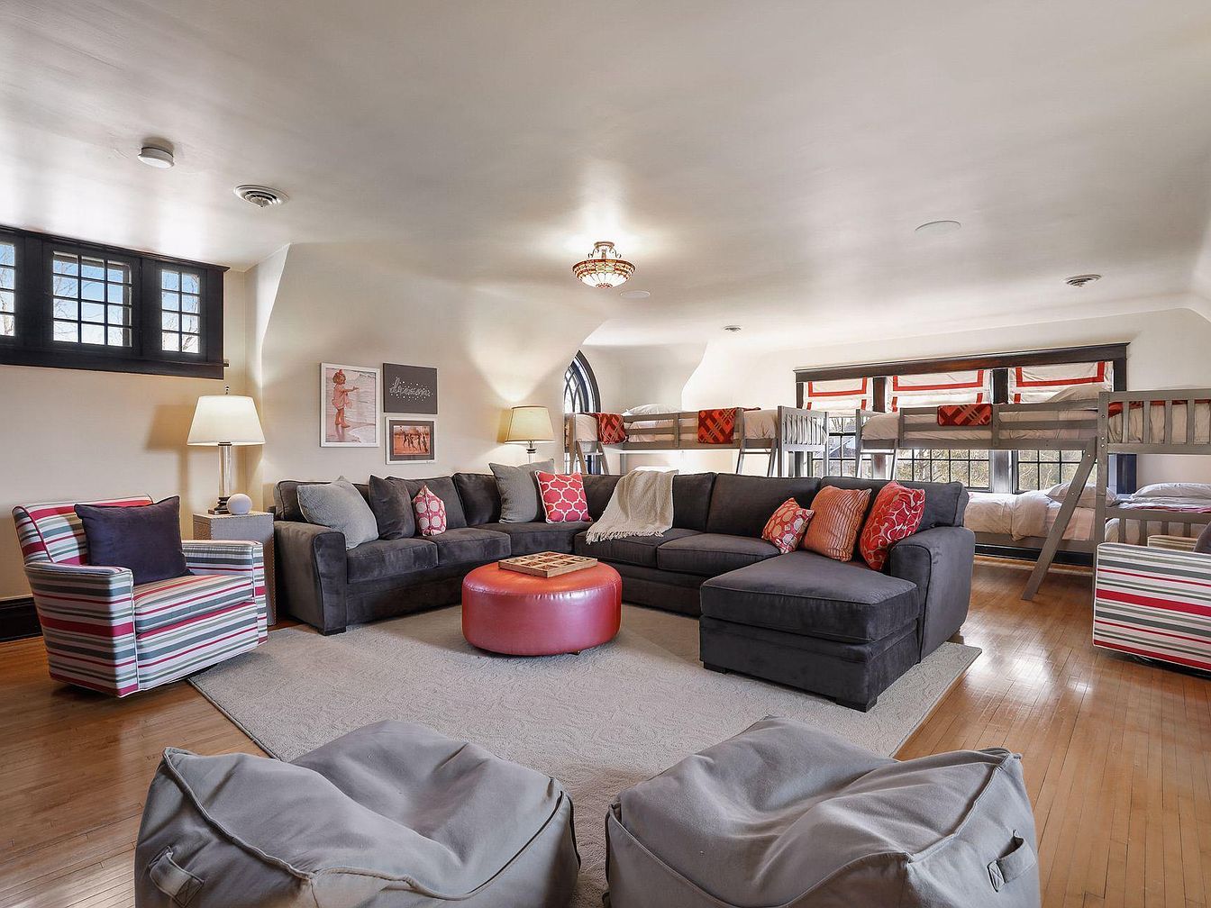 A spacious, inviting family room effortlessly combines comfort and functionality, making it perfect for both relaxation and sleepovers. The layout features a large sectional sofa with soft, neutral upholstery accented by playful patterned pillows, centered around a round, red ottoman. Striped armchairs and plush bean bags offer additional seating, ensuring there’s space for everyone. Along one wall, built-in bunk beds with cheerful red-and-white bedding create a fun, communal sleeping area ideal for kids. The light hardwood floors, soft area rug, and warm, creamy wall color contribute to a cozy atmosphere. Large windows allow for ample natural light, while modern lamps and tasteful wall art enhance the welcoming feel.