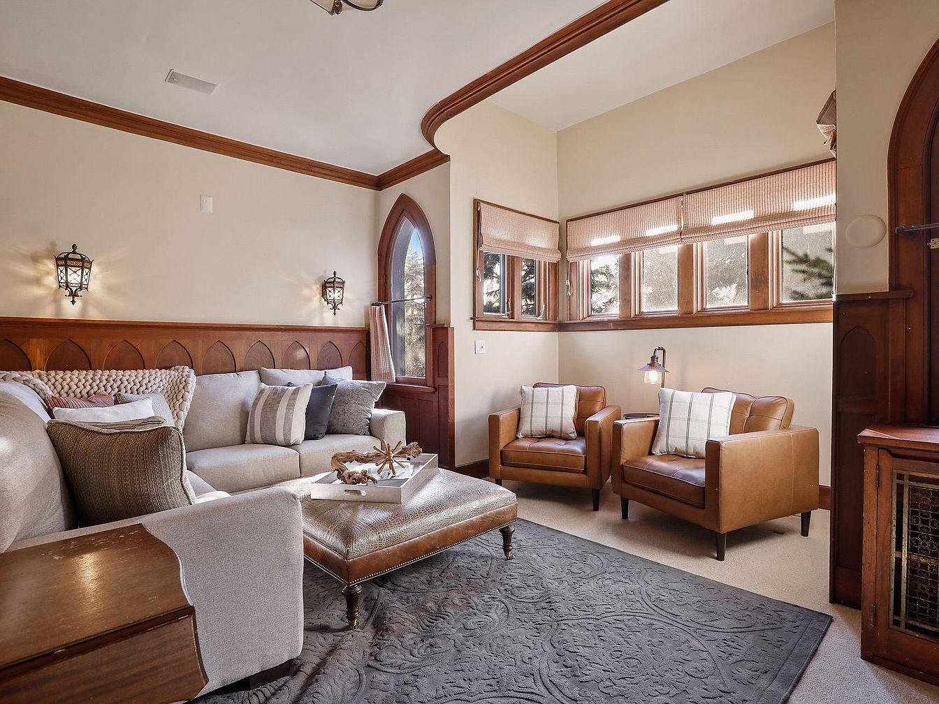 A warm and inviting living room nook boasts a neutral color palette accented by deep wood trim and arched window frames, creating an elegant yet approachable atmosphere. Plush beige sectional seating, paired with textured throw pillows and a soft blanket, offers a welcoming spot for family gatherings or relaxation. Two caramel leather armchairs with plaid cushions sit beside a large grouping of windows, flooding the space with natural light. A tufted leather ottoman serves as a central coffee table atop an ornate rug, while decorative wall sconces and paneled wainscoting add architectural charm and timeless character to the setting.