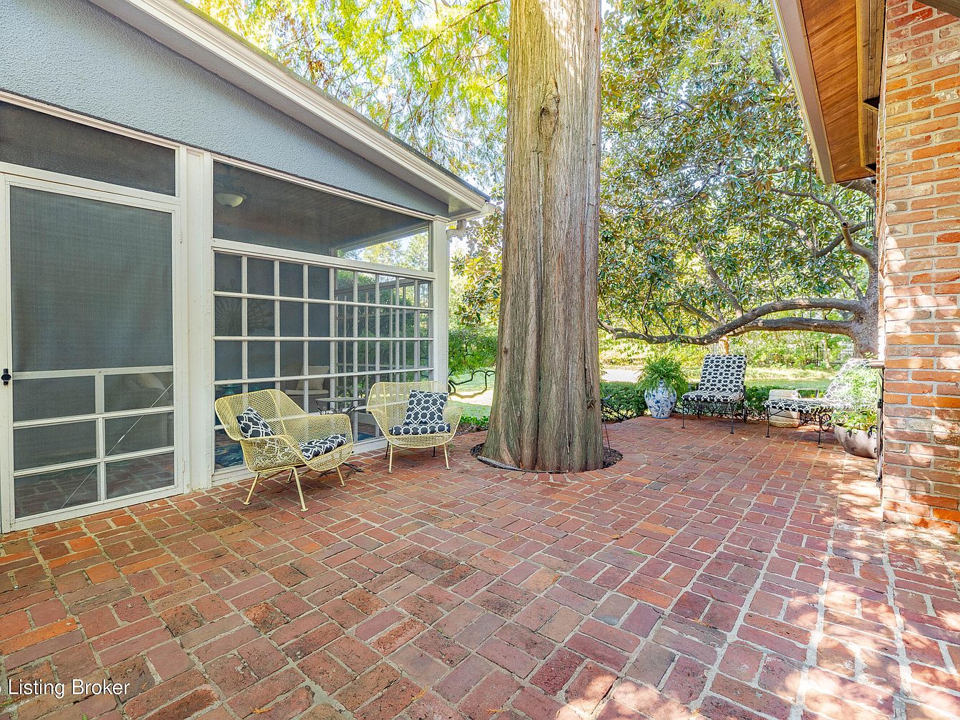 This inviting outdoor patio is framed by a flourishing tree, enhancing its tranquil atmosphere. The layout features a cozy seating area with stylish wrought-iron chairs adorned with patterned cushions, offering family-friendly comfort. A circular table creates a perfect space for al fresco dining, encouraging gatherings. The warm hues of antique bricks complement the soft-toned walls and nearby greenery, creating a harmonious color scheme. Architectural details such as the lattice skirting and screened porch add character, while large windows invite natural light, blending indoor and outdoor living seamlessly. A peaceful retreat for both relaxation and socializing.