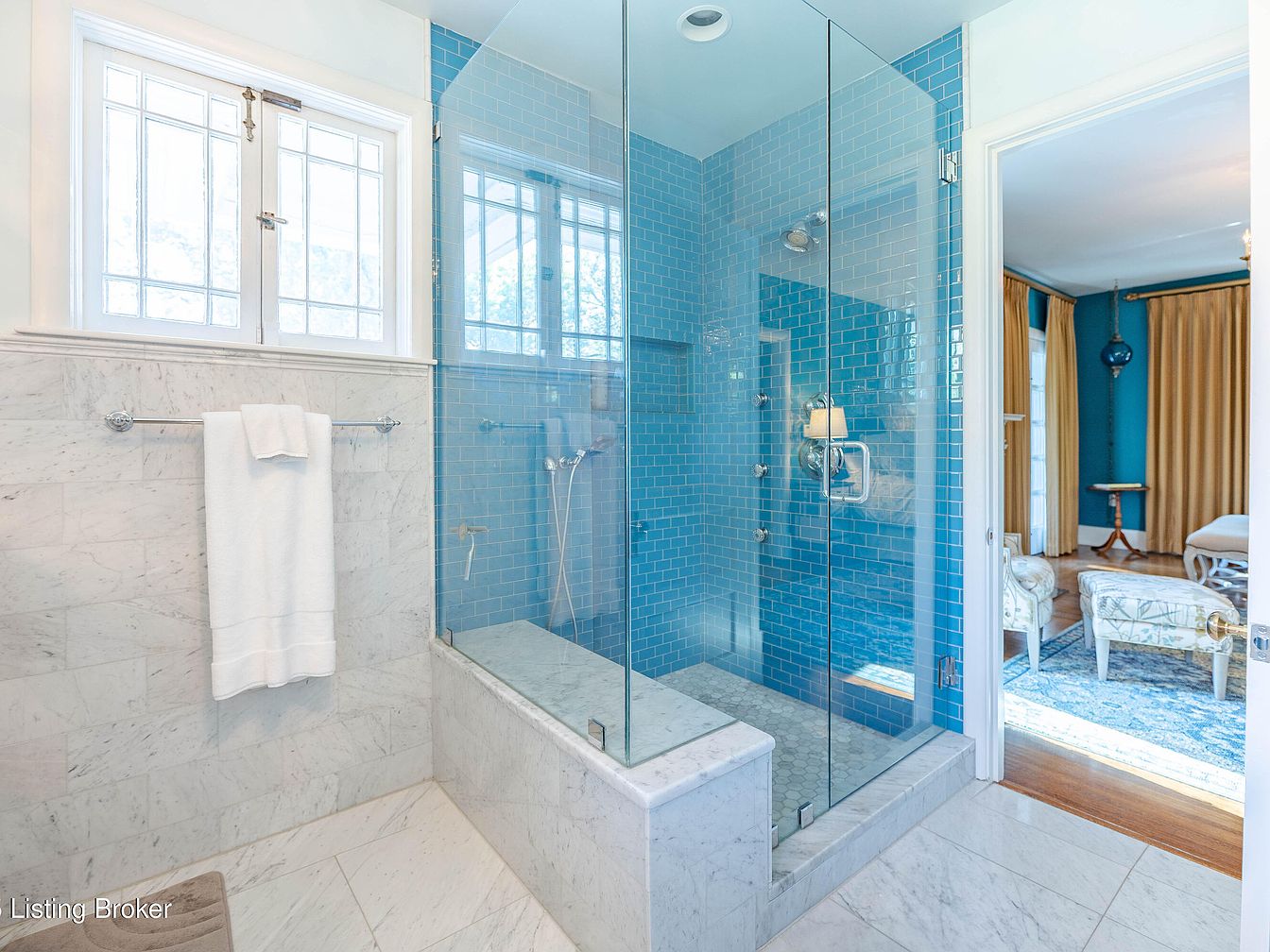 This chic bathroom features a modern yet timeless aesthetic, highlighted by stunning blue subway tile that provides a refreshing contrast against the elegant marble surfaces. The glass-enclosed shower offers a spacious feel, complete with multiple shower heads for a luxurious experience. Natural light pours in through the beautifully designed window, enhancing the airy atmosphere. Alongside plush towels and understated accessories, the design seamlessly blends functionality with sophistication. The combination of soft colors and polished fixtures invites tranquility, making it an ideal family-friendly space for relaxation and rejuvenation, perfect for unwinding after a long day.